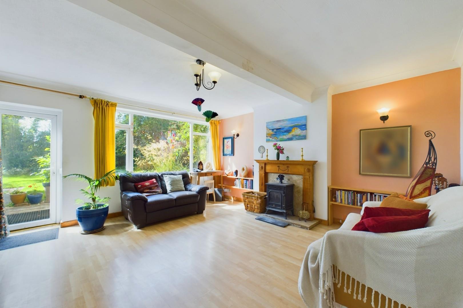 With a door leading from the entrance hall, open plan to kitchen, log burning stove with decorative surround and hearth, a door leading to the rear garden, a central heating radiator and double glazed windows to the rear