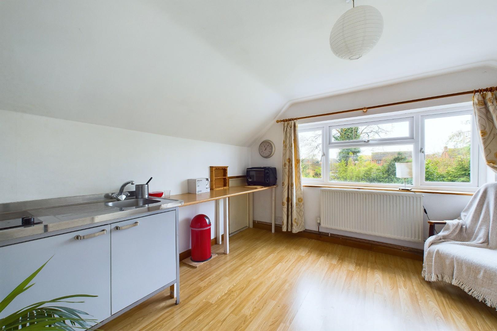 With a door leading from the landing, Ikea mini kitchen comprising sink, drainer & electric hob with mini fridge and cupboard under, eaves storage to both sides, a double glazed window to the rear and a central heating radiator