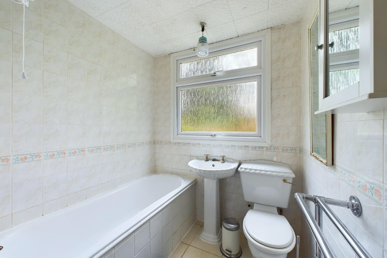 With a door leading from the landing, WC, hand wash basin and bath with shower over, built in store cupboard and a double glazed window to the side