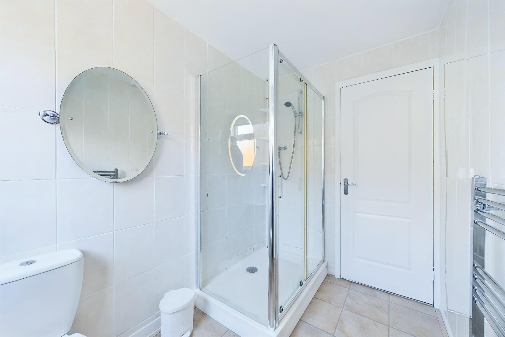 With a door leading from the hallway, full height tile surround, WC, hand wash basin, shower cubicle with glass surround, a central heating radiator and a double glazed window to the