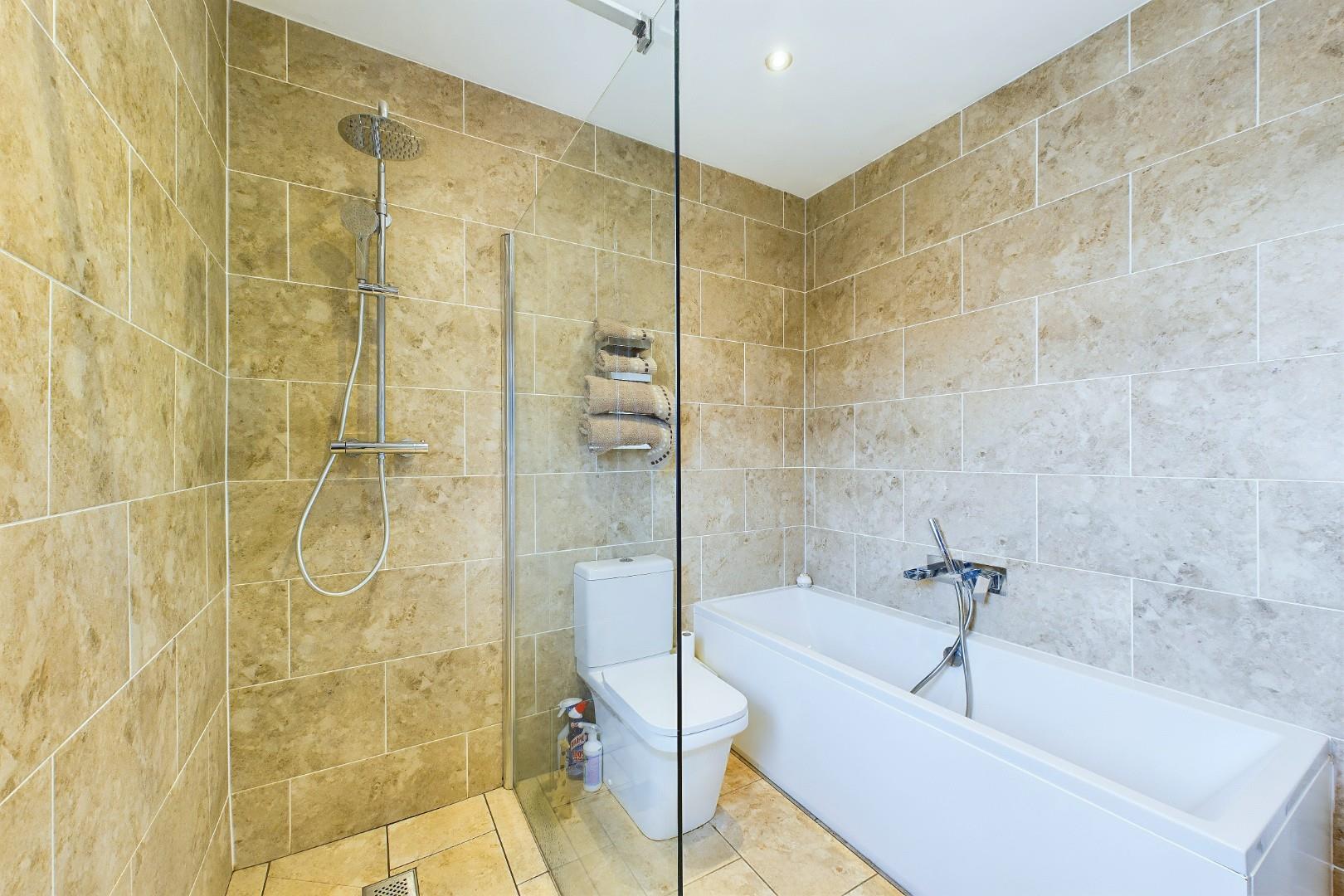With a door leading from the landing, full height tile surround throughout, WC, hand wash basin, bath tub with handheld shower and mixer tap, walk in shower with glass screen, a double glazed window to the front and a central heating radiator
