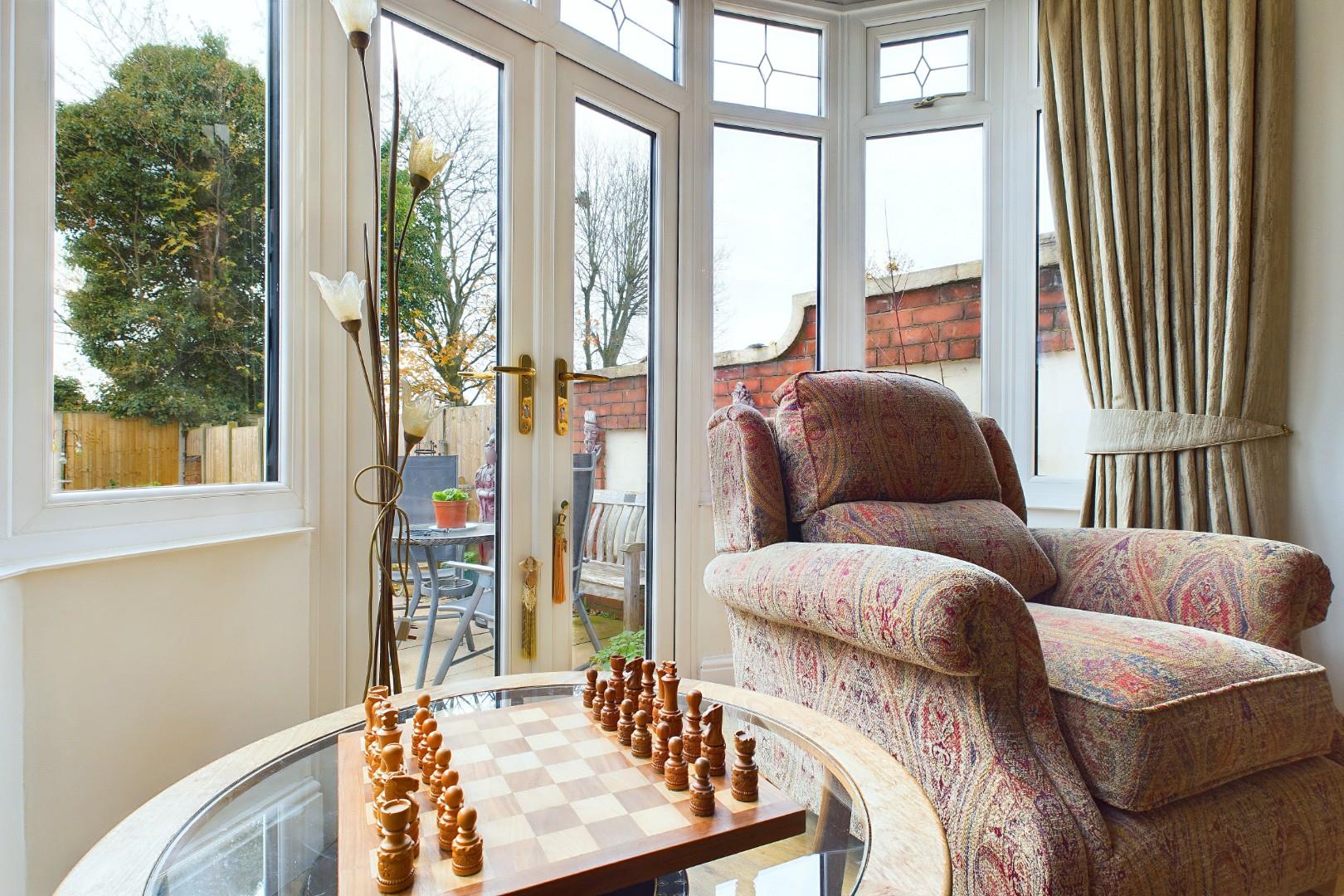 With a UPVC door leading from the driveway, original stained glass door leading to the entrance hall and double glazed windows to the side