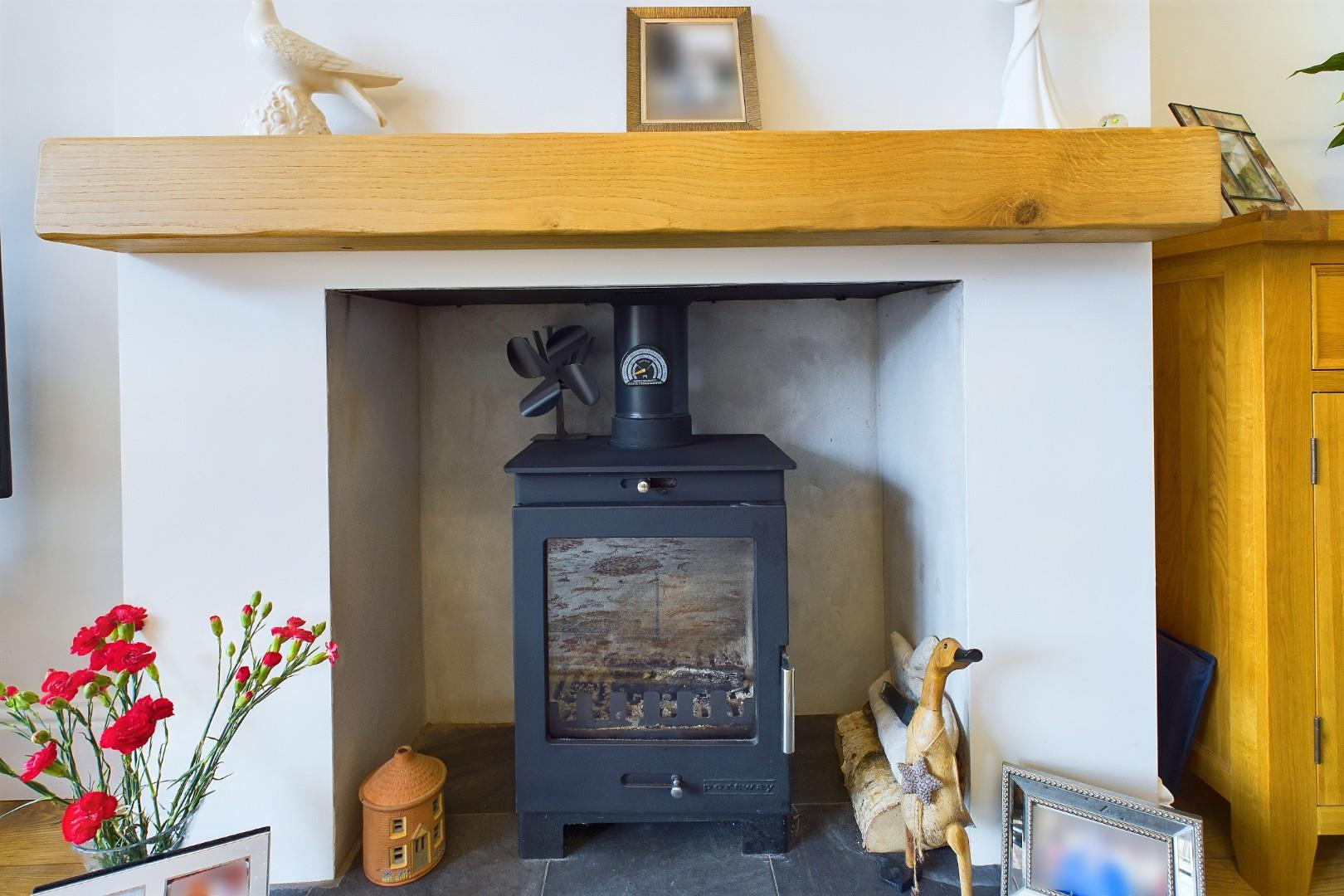 With a door leading from the entrance hall, solid fuel burning stove with hearth, a double glazed bay patio doors to the rear and a central heating radiator