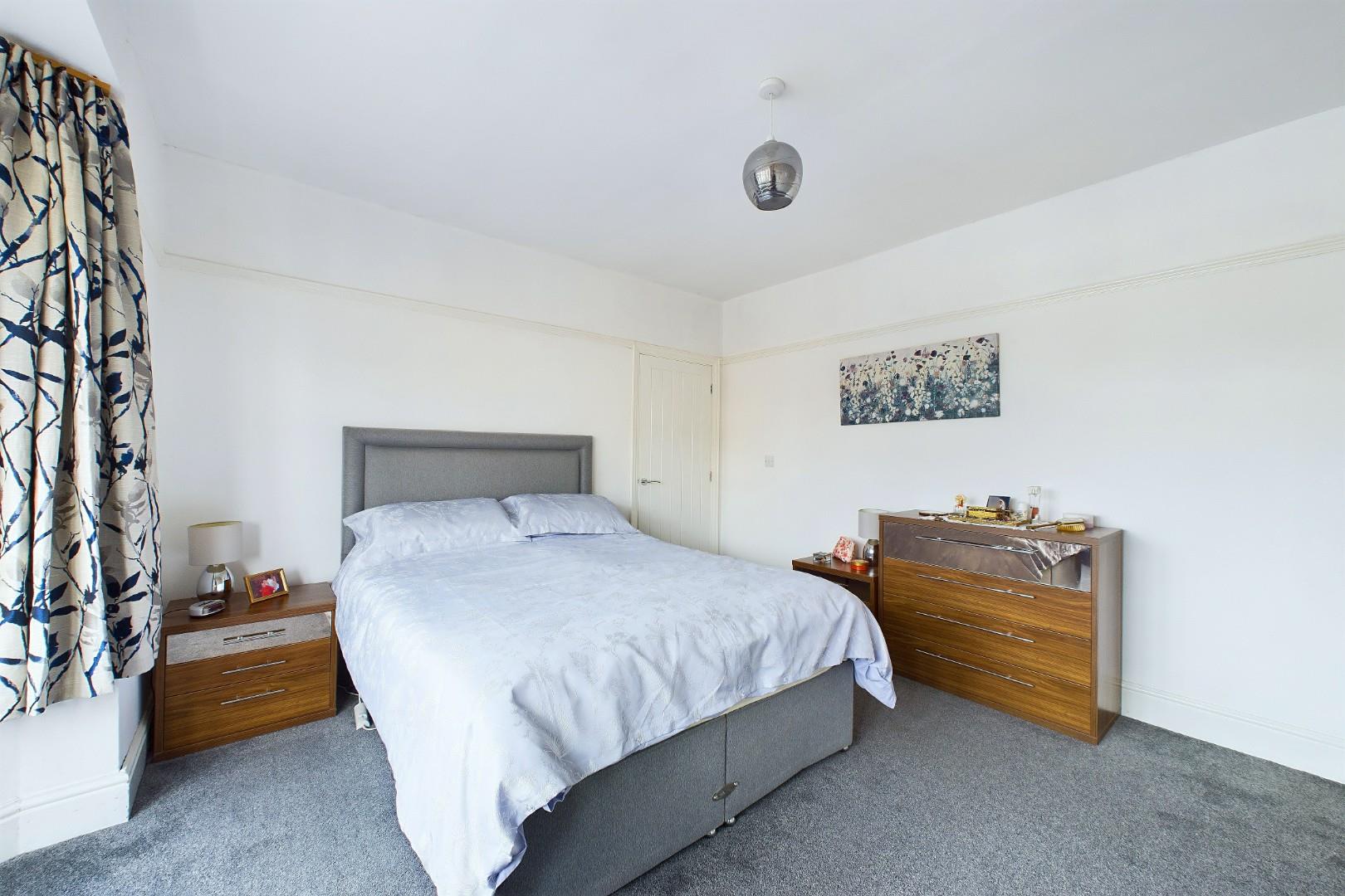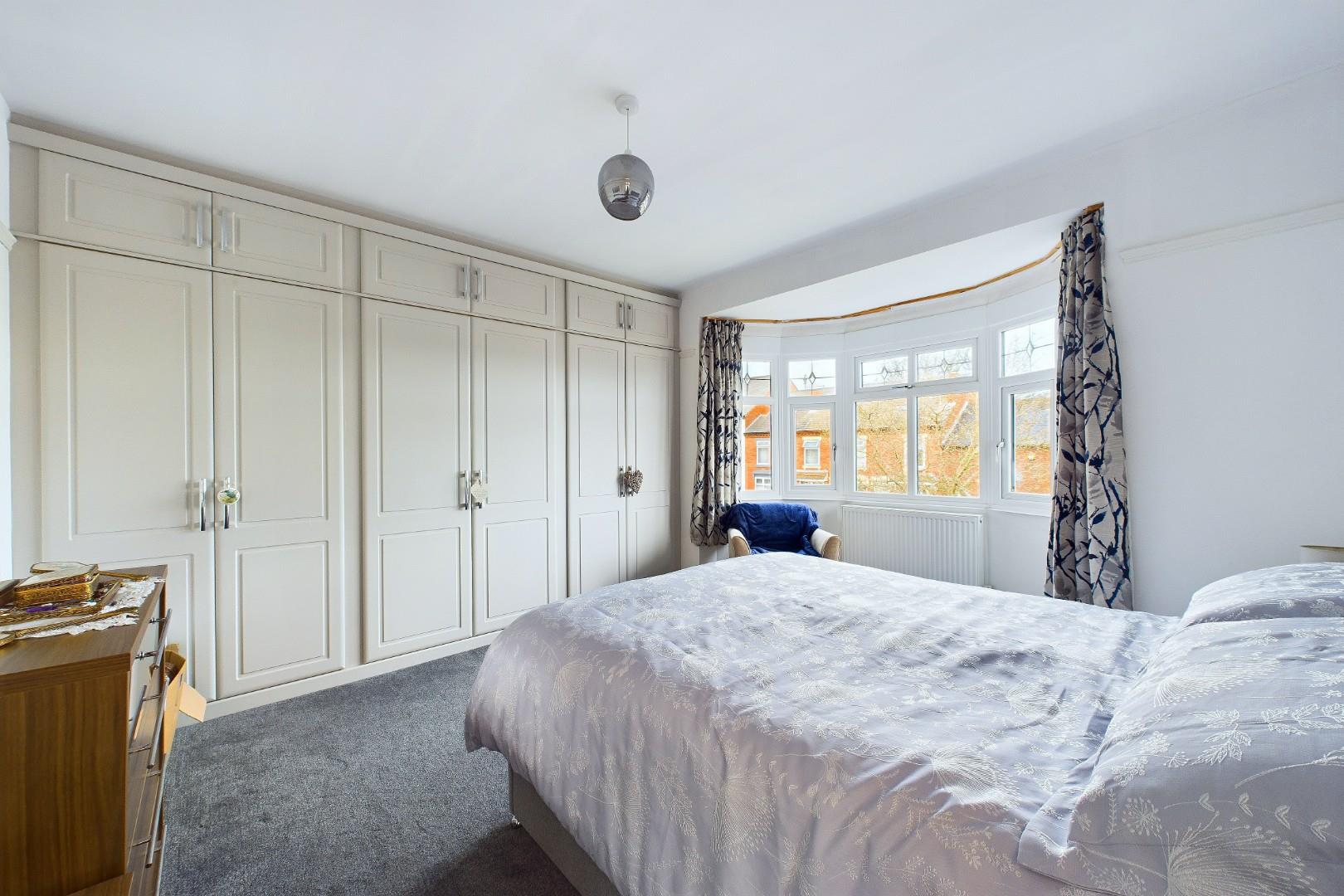 With a door leading from the landing, fitted wardrobe storage to one wall, a double glazed bay window to the front and a central heating radiator