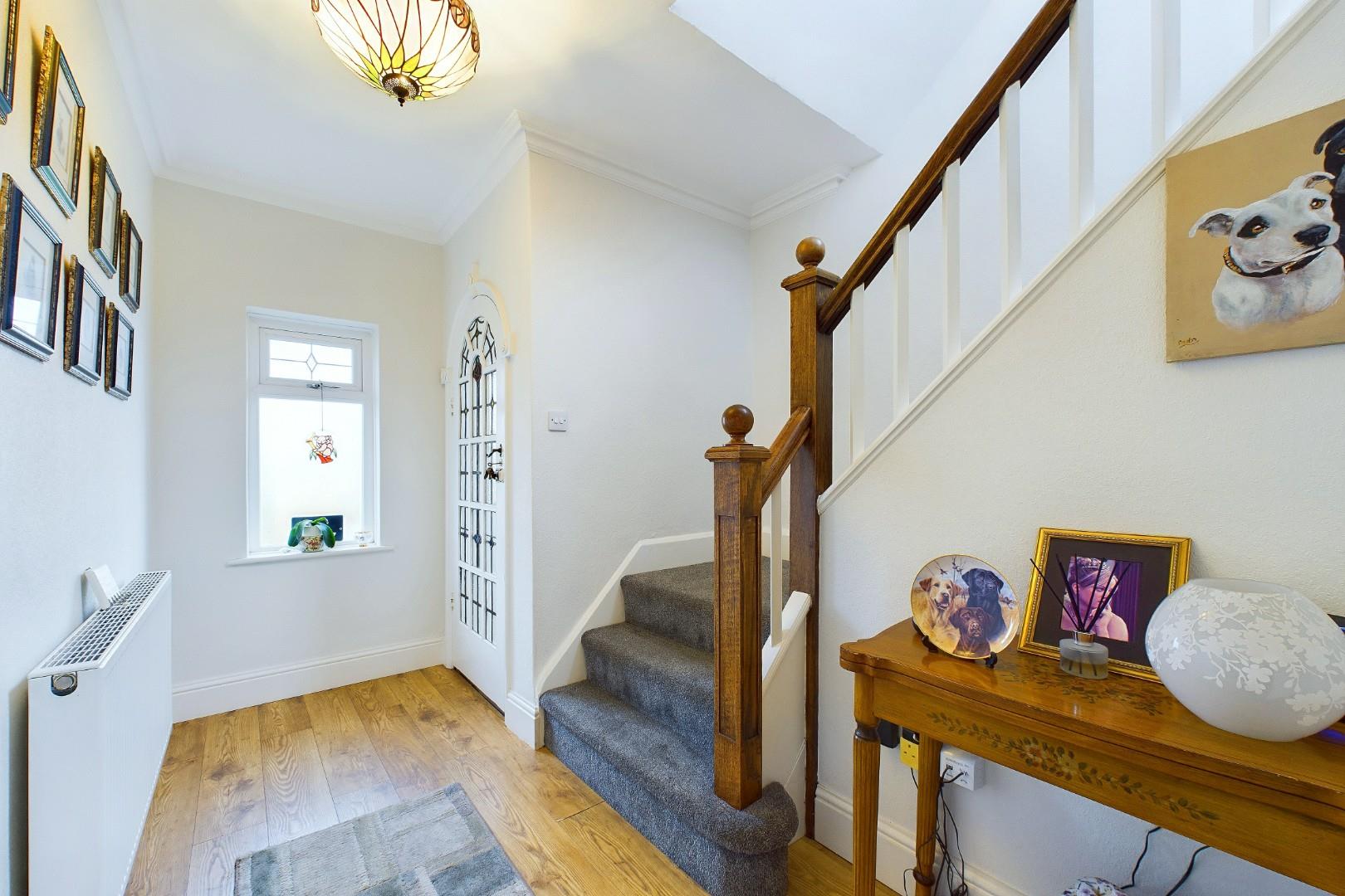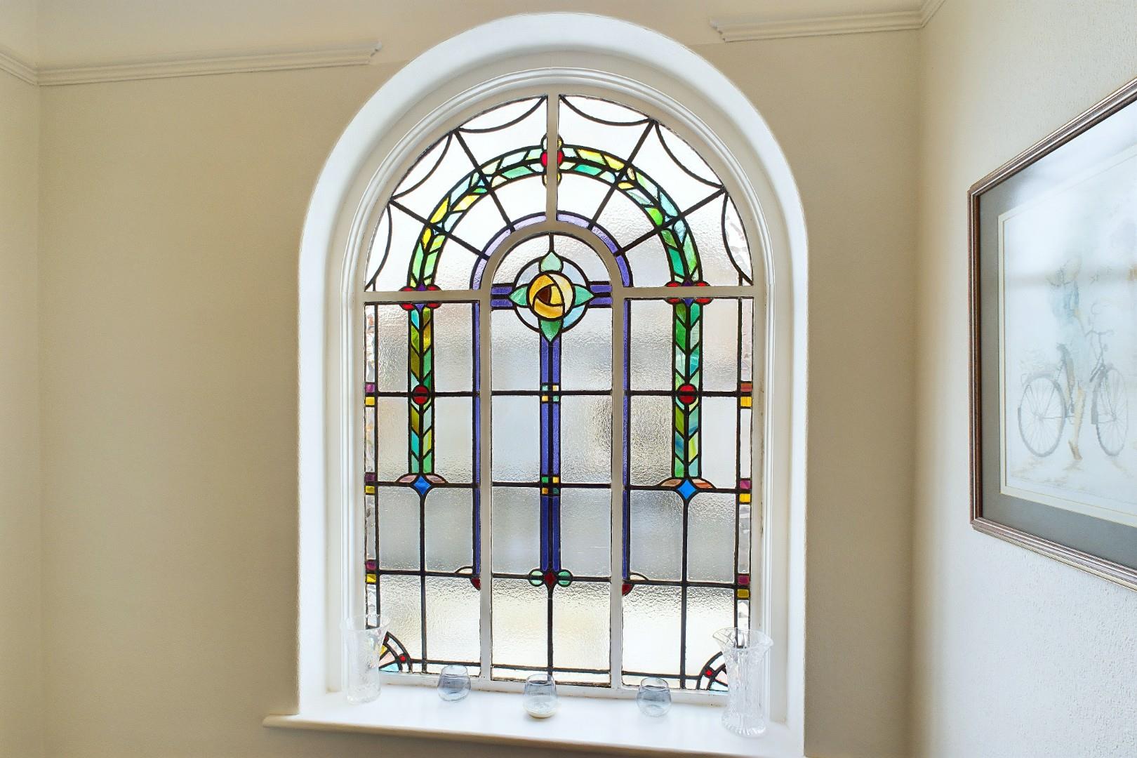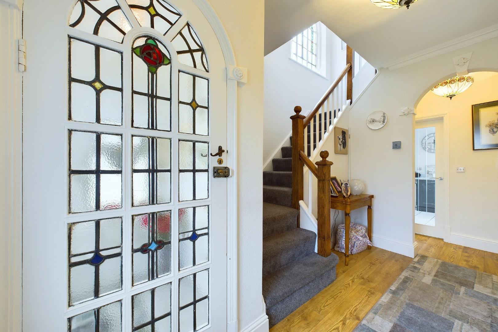 With stairs leading from the entrance hall, doors to various rooms, a central heating radiator and an original stained glass feature window to the side