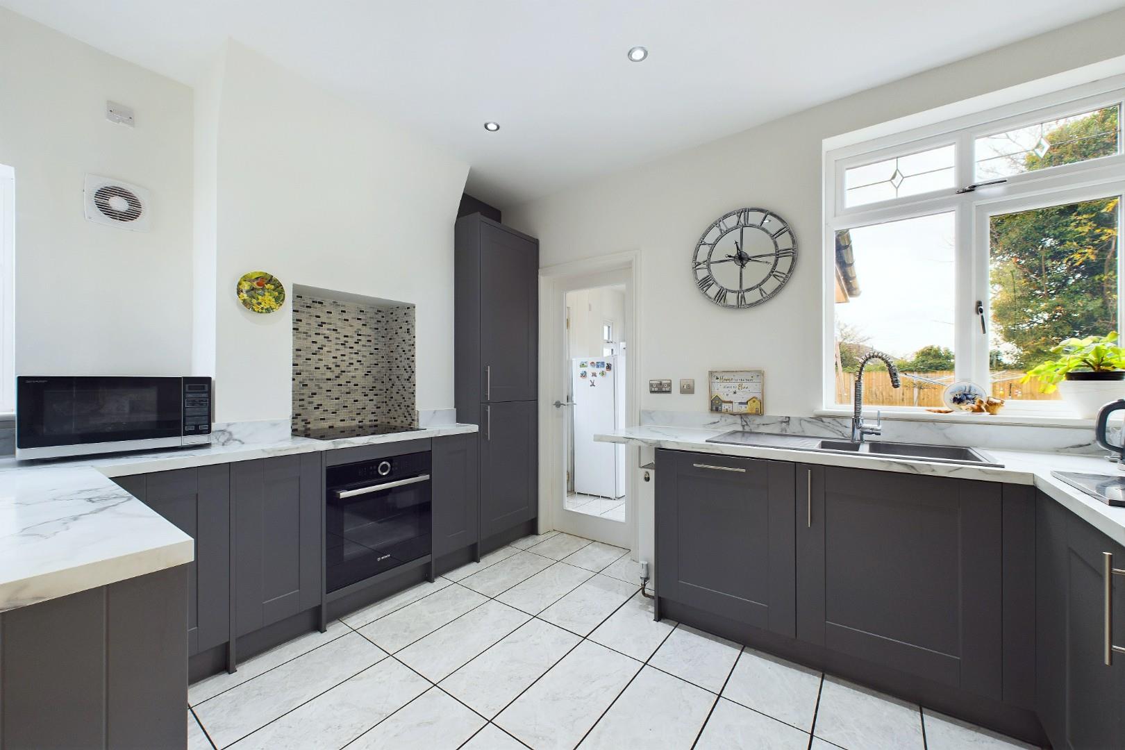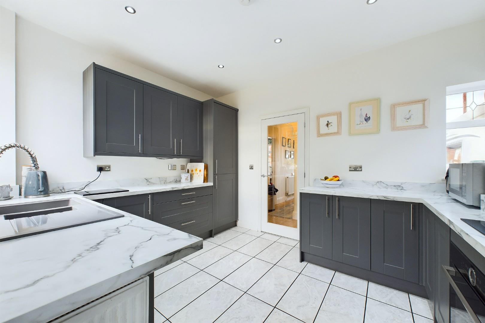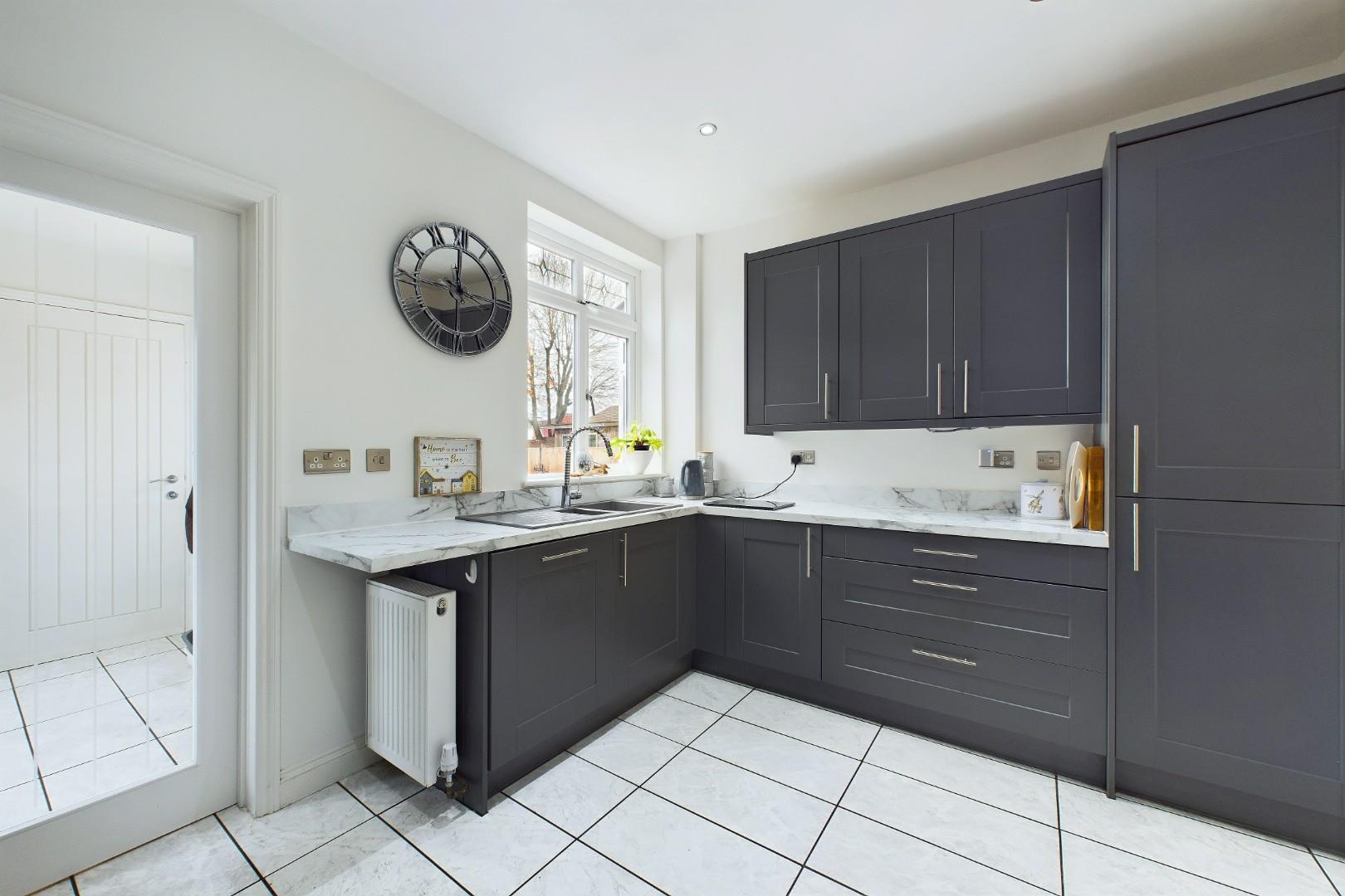 With a door leading from the entrance hall and a door leading to the utility, recently fitted kitchen with a range of wall and base units with worktops above, integrated oven with hob above, integrated dishwasher, sink with mixer tap, double glazed windows to the side and rear and a central heating radiator