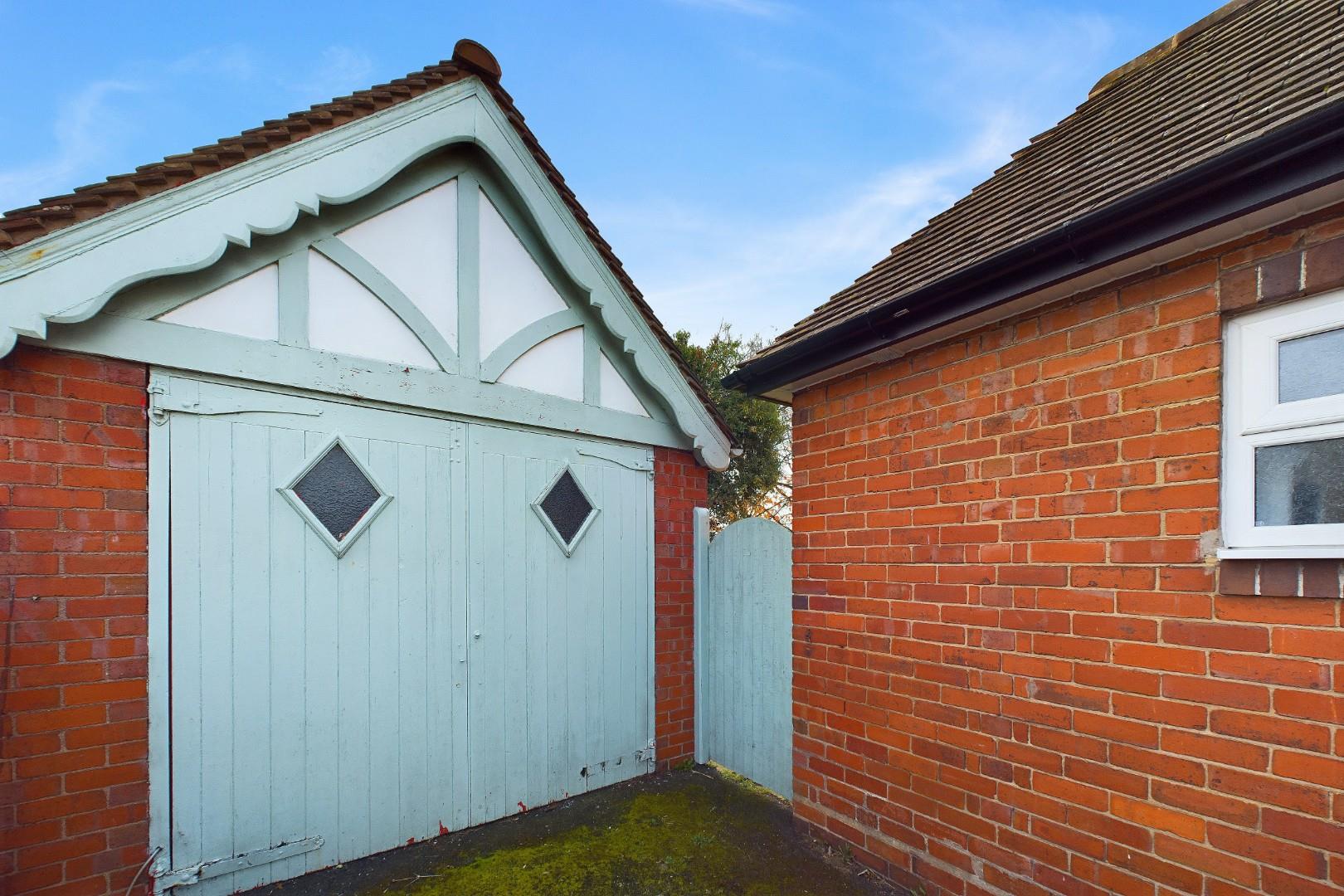 With a dropped kerb offering vehicular access to a tarmacadam driveway, half height wall bordering the lawn to the front, side access gate and door to utility, garage doors leading to the detached garage and steps leading to the entrance porch