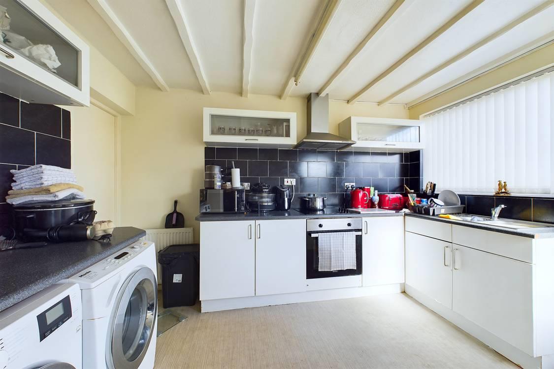 leading from the dining room, fitted with a range of wall and base units with worktops above, stainless steel sink with mixer tap, utility outlet points, a double glazed window to the rear, a central heating radiator and doors leading to the rear garden
