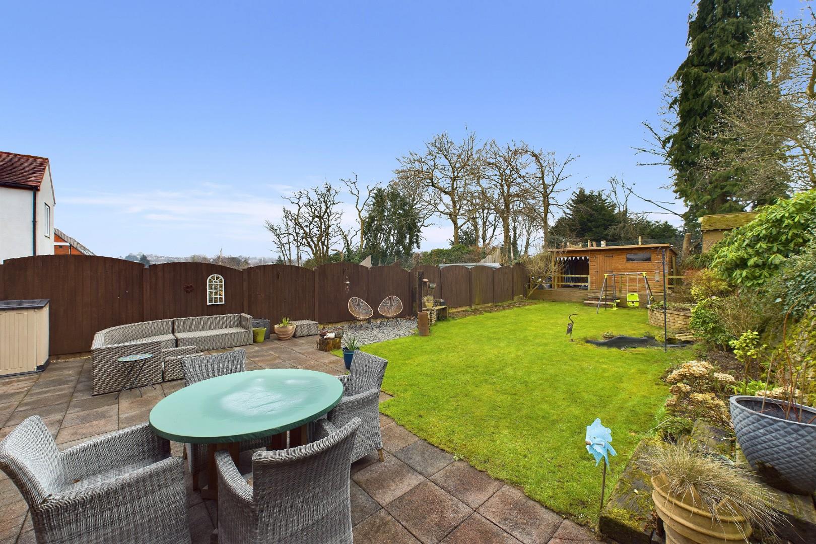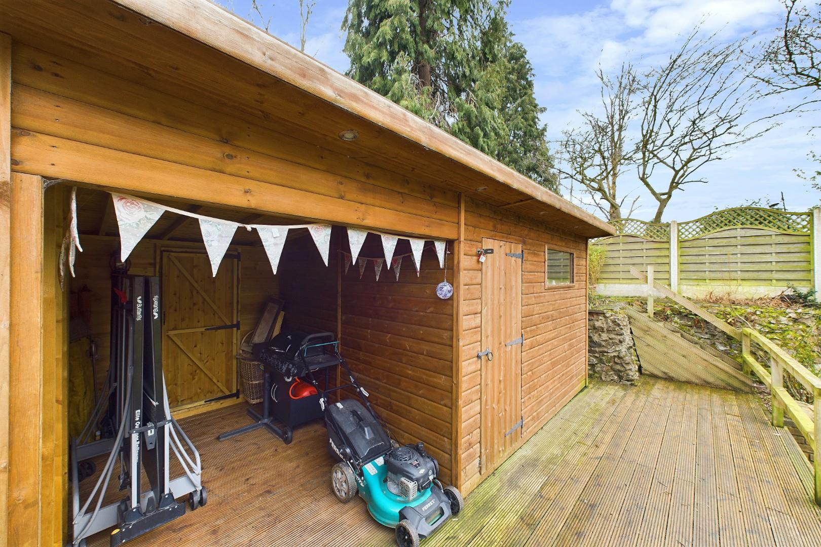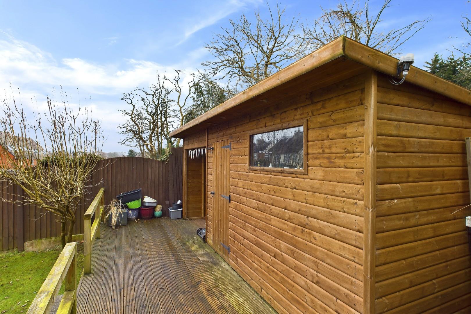 With doors leading from the dining room and utility, patio area to the front with mature shrub borders and lawn beyond, raised deck area to the rear with garden building (with power supply) and a side access gate to the driveway