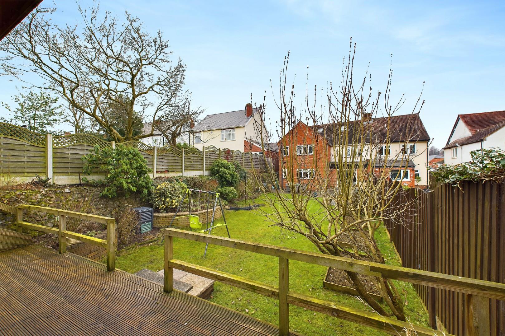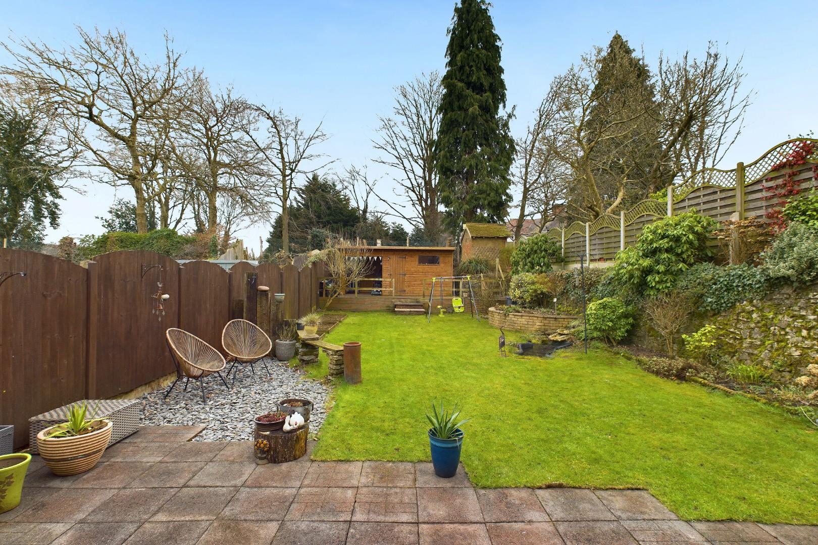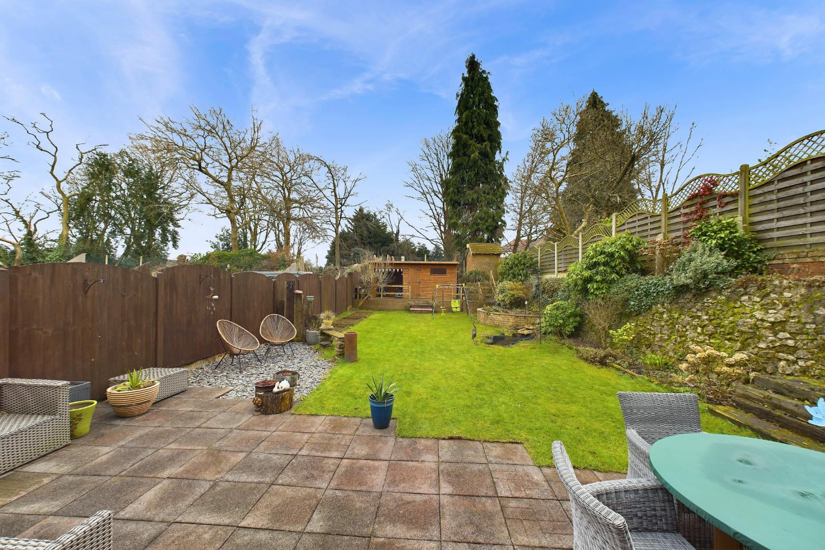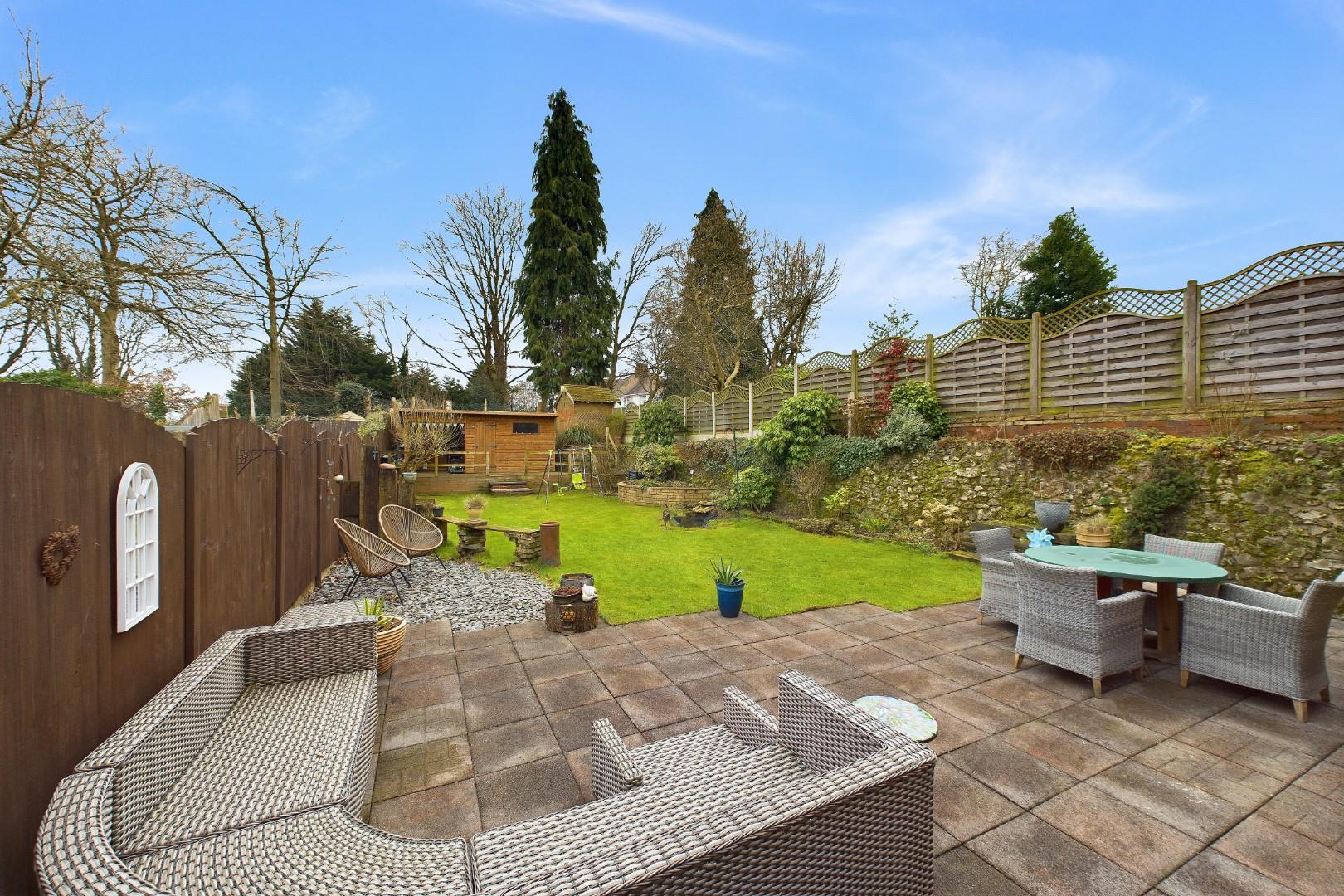 With doors leading from the dining room and utility, patio area to the front with mature shrub borders and lawn beyond, raised deck area to the rear with garden building (with power supply) and a side access gate to the driveway