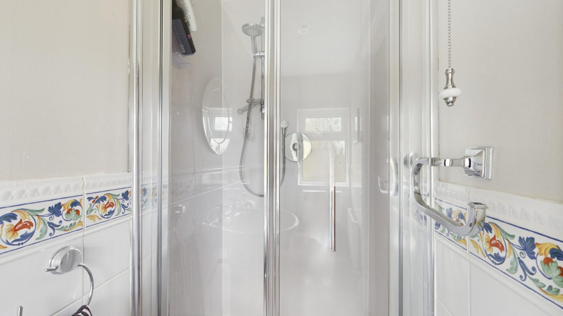 With a door leading from the bedroom, half height tile surround, WC, hand wash basin, shower cubicle with glass screen, a central heating radiator and a double glazed window to the rear