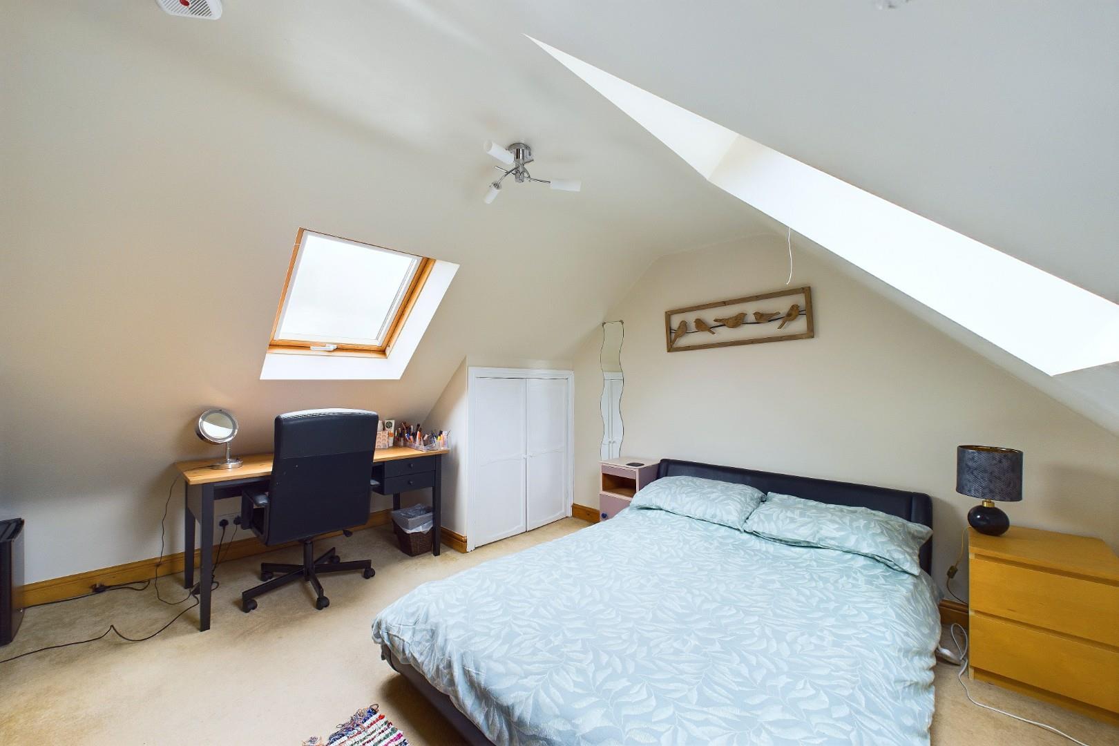 With a door leading from the second floor landing, access to eaves storage, skylight windows to the front and rear and a central heating radiator