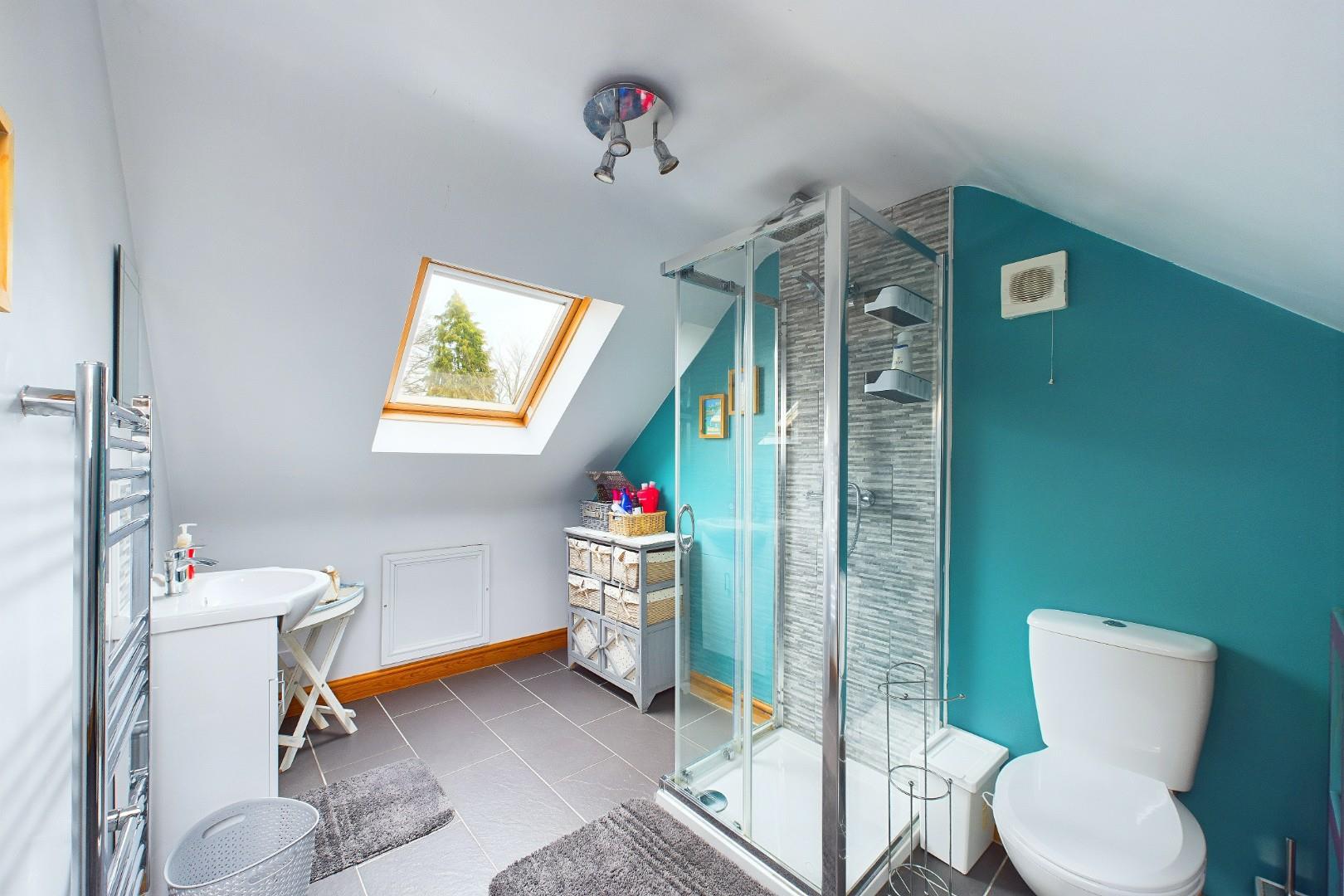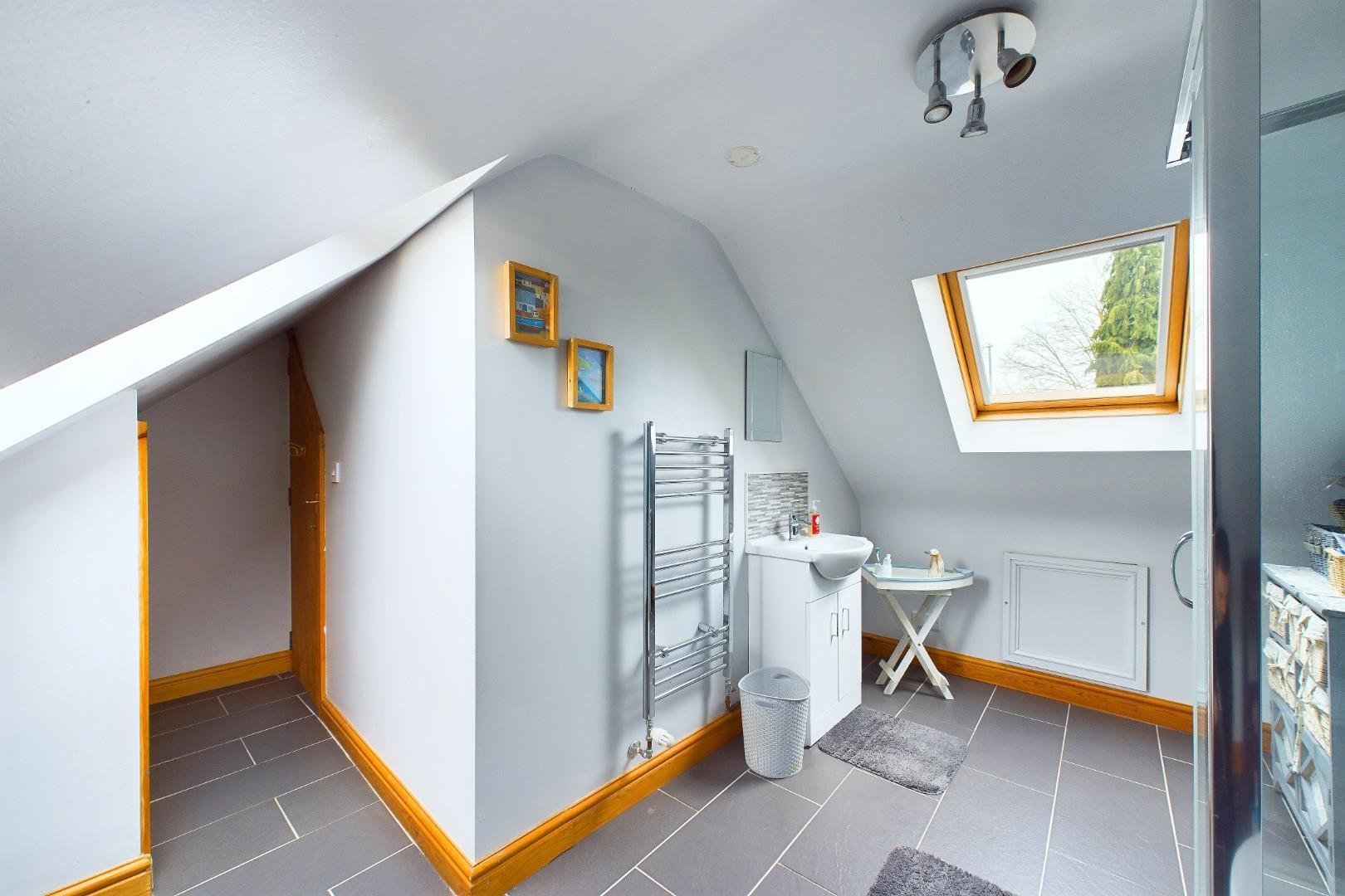 With a door leading from the second floor landing, WC, hand wash basin, shower cubicle with glass screen, skylight windows to the front and rear, access to eaves storage and a central heating radiator