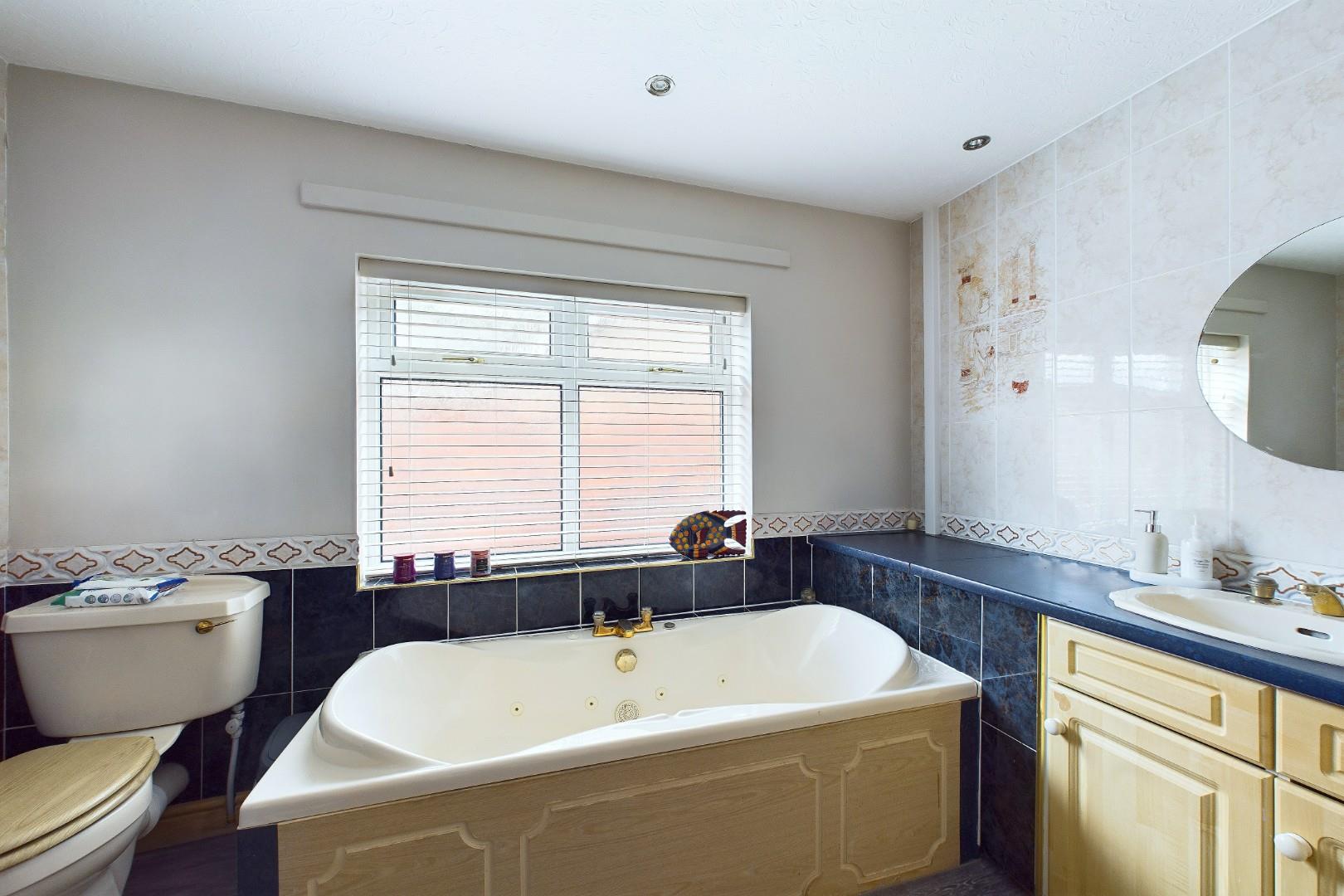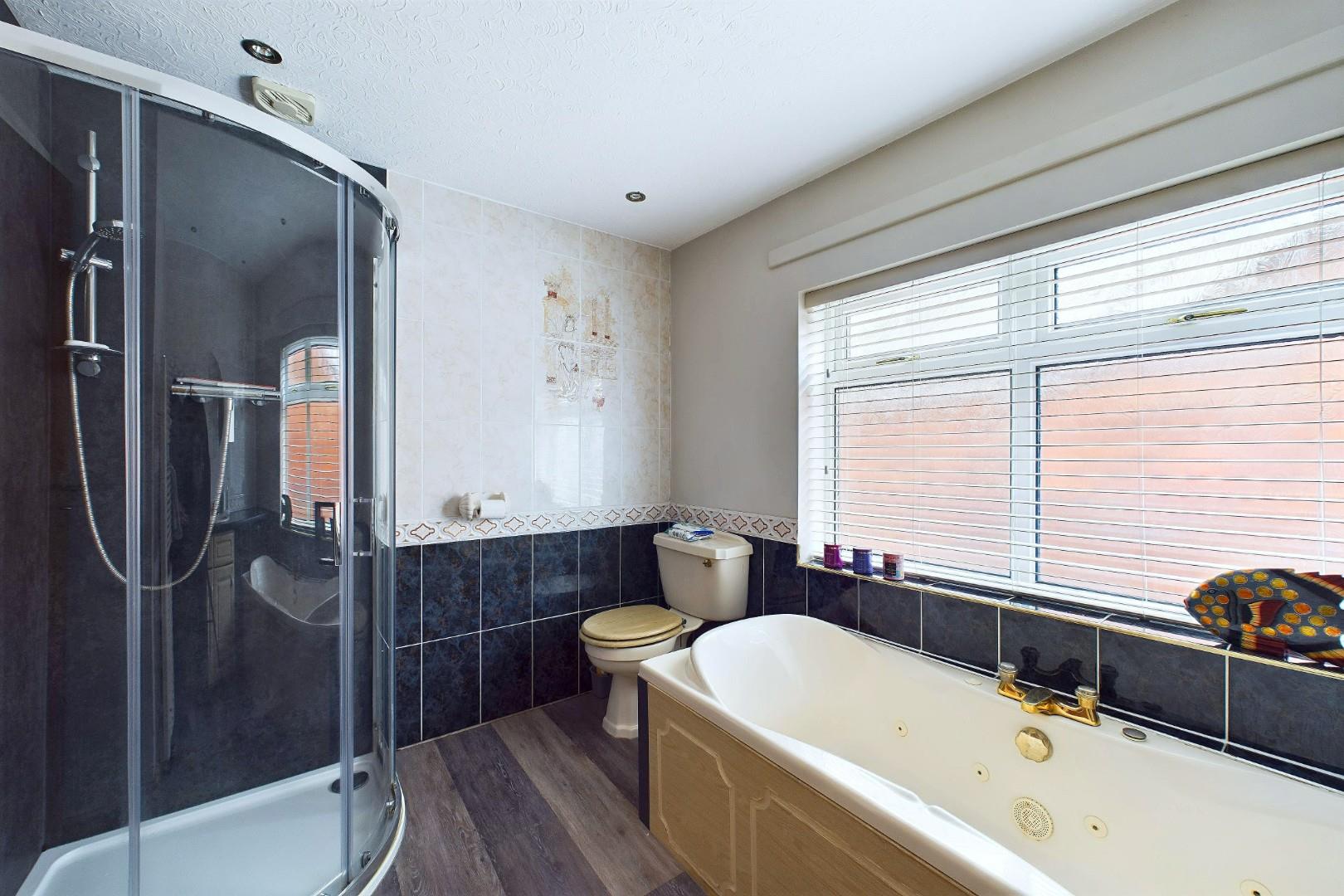 With a door leading from the landing, WC, hand wash basin with storage below, spa bath with mixer tap, shower cubicle with glass screen, a double glazed window to the side and a central heating radiator