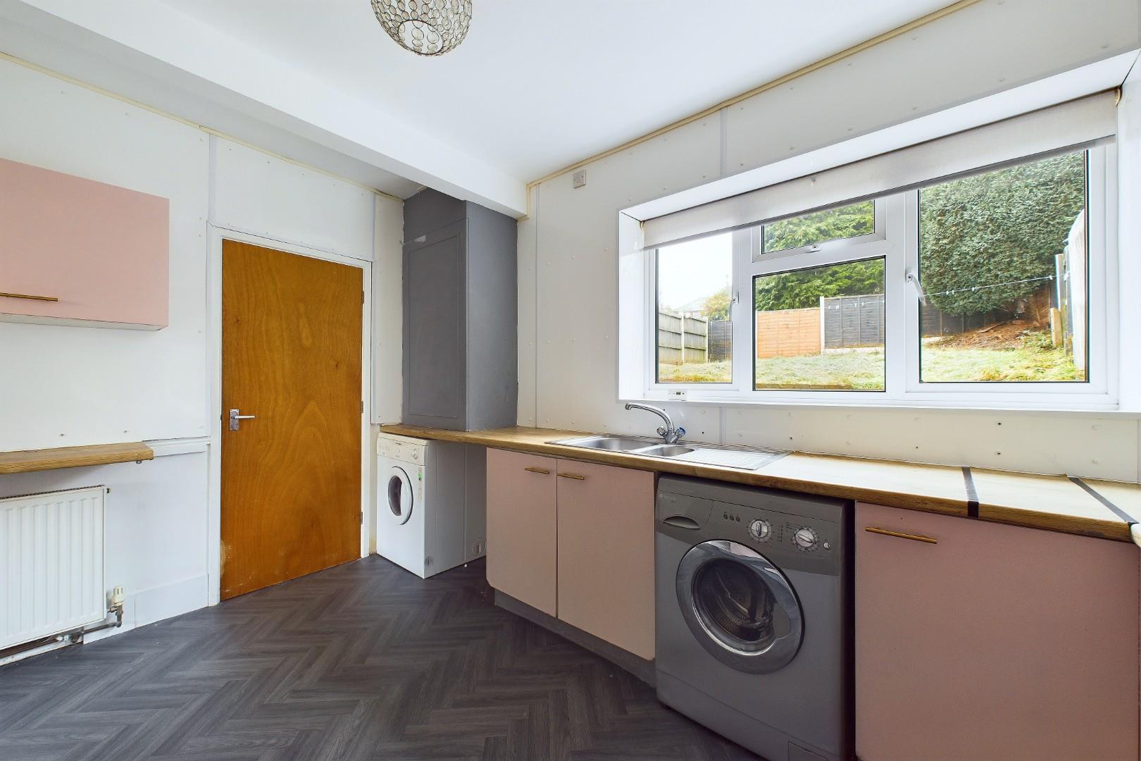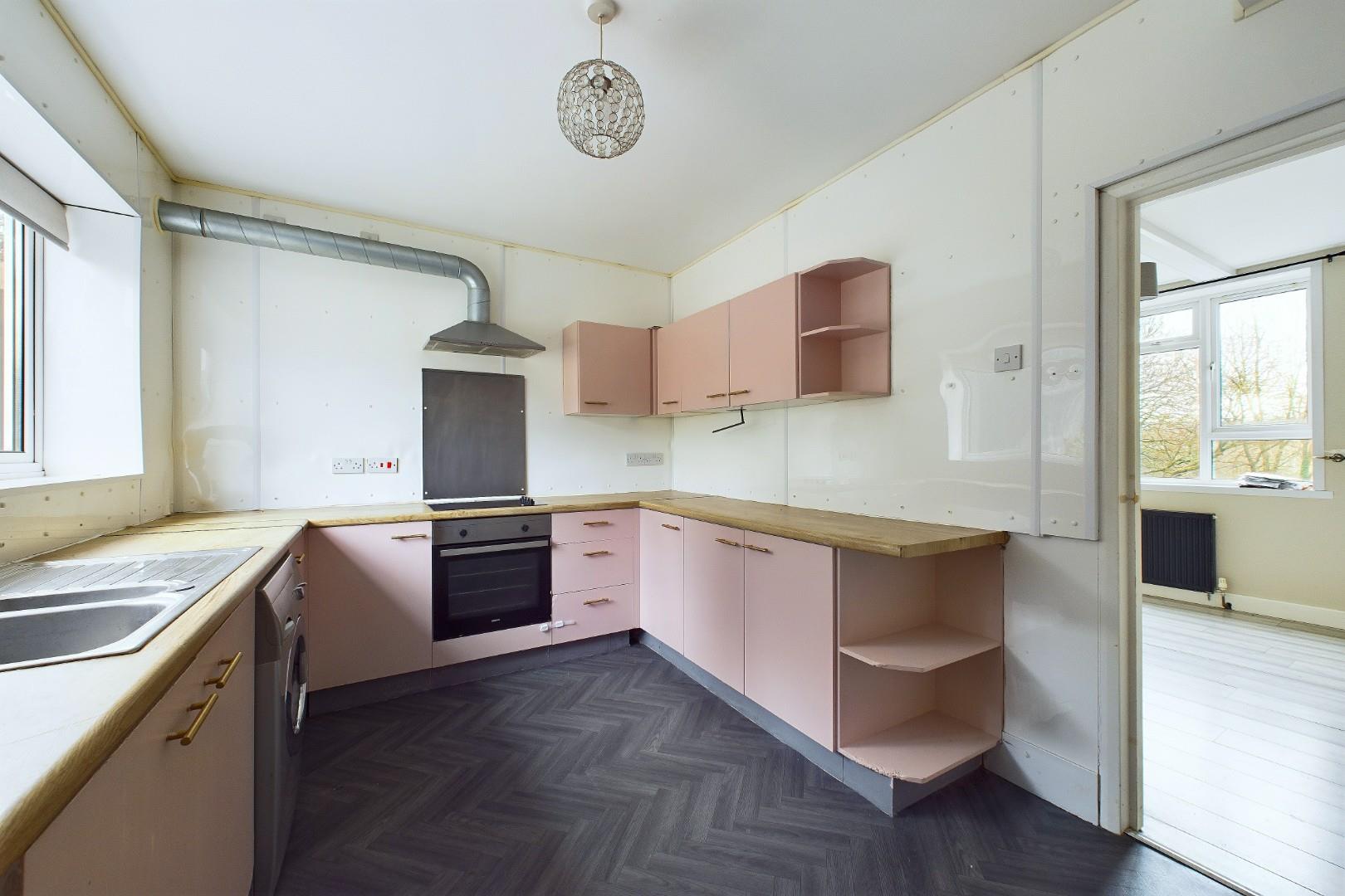 With a door leading from the living room, fitted with a range of wall and base units with worktops, stainless steel sink with tap, integrated oven and hob with extractor above, a door leading to the ground floor WC, a double glazed window to the rear and a central heating radiator