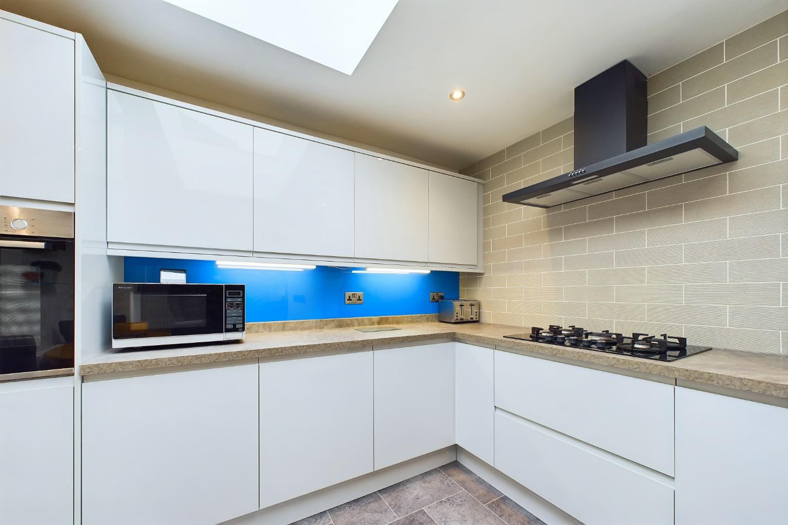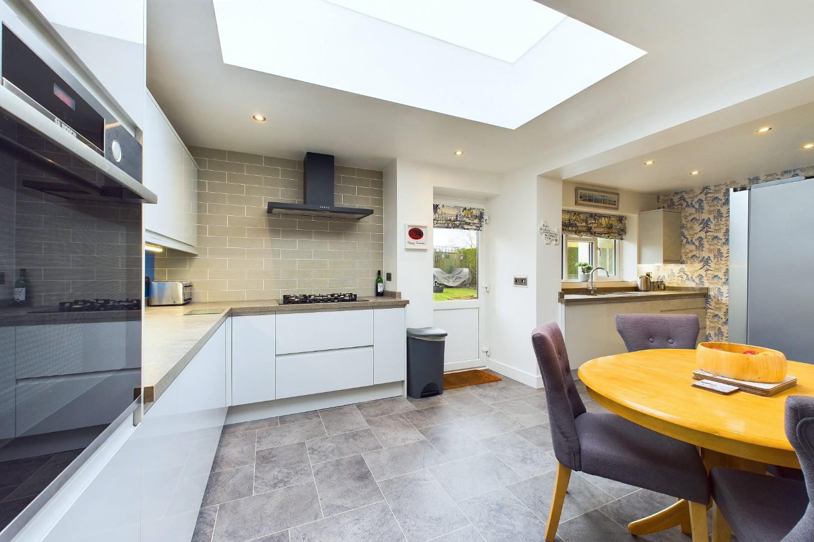 With a door leading from the living room, fitted with a range of wall and base units with worktops, integrated appliances, hob with extractor hood above, doors leading to the garage and garden, a double glazed lantern window, a double glazed window to the rear and a central heating radiator