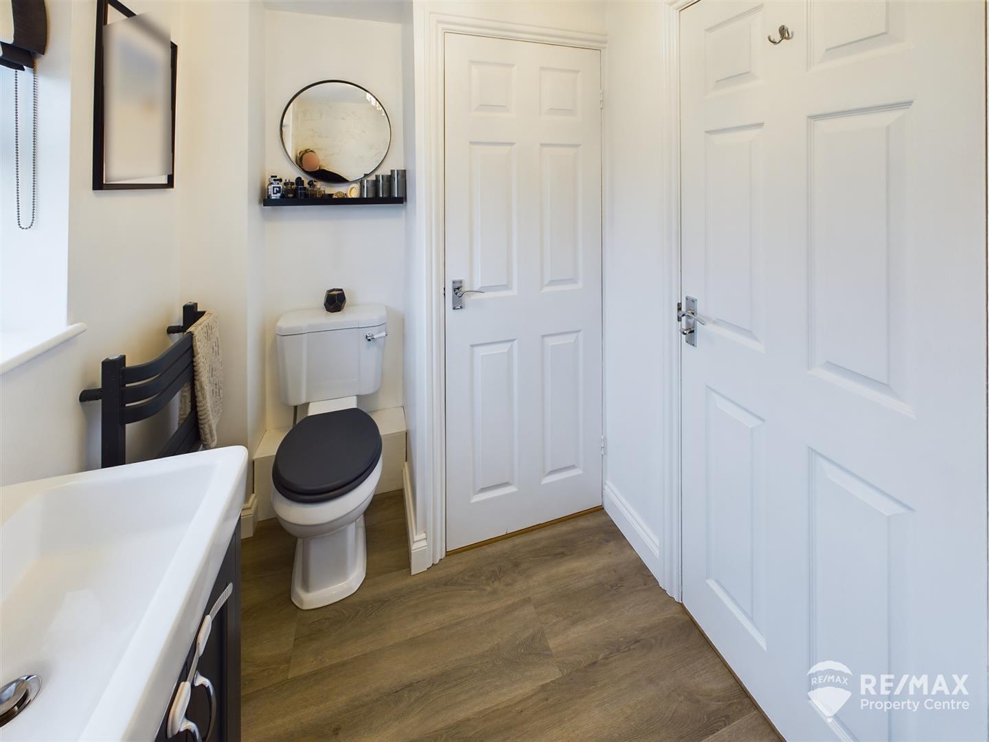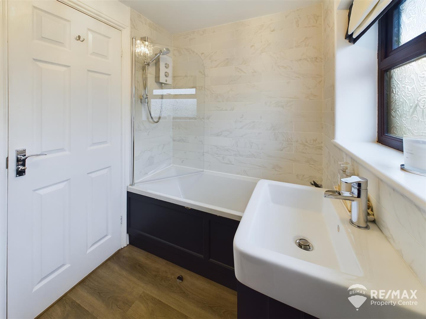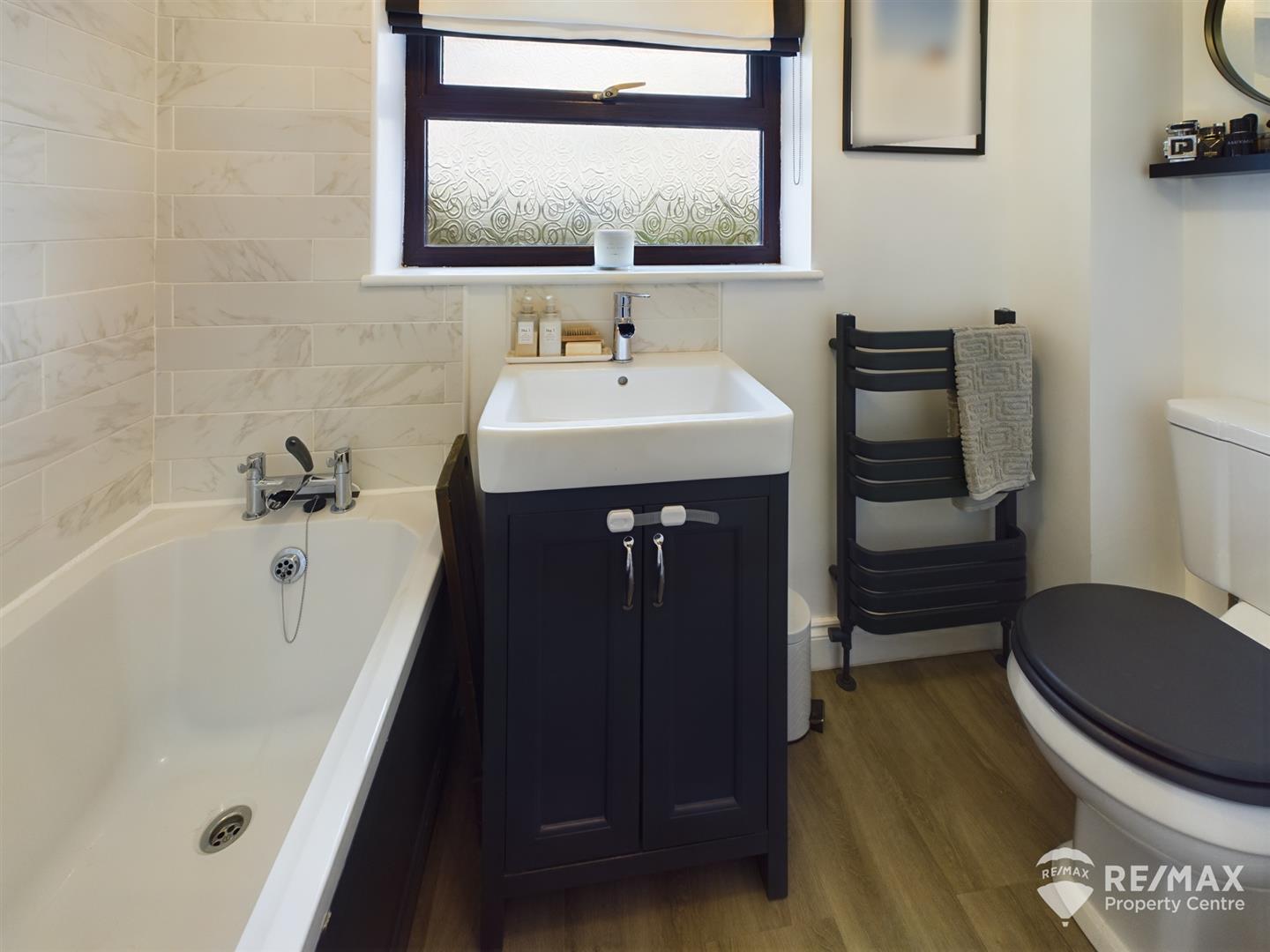 Modern suite comprising panelled bath with wall mounted shower, low level WC, sink in vanity unit, heated towel rail, airing cupboard housing water tank and obscured window to rear aspect