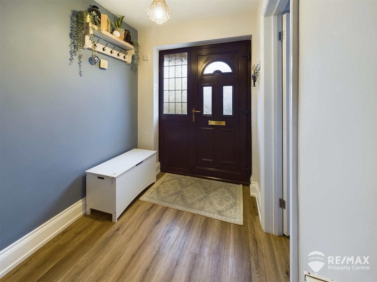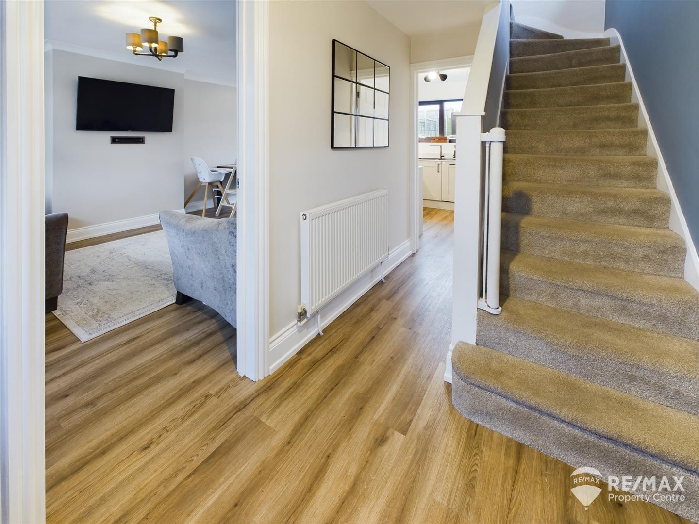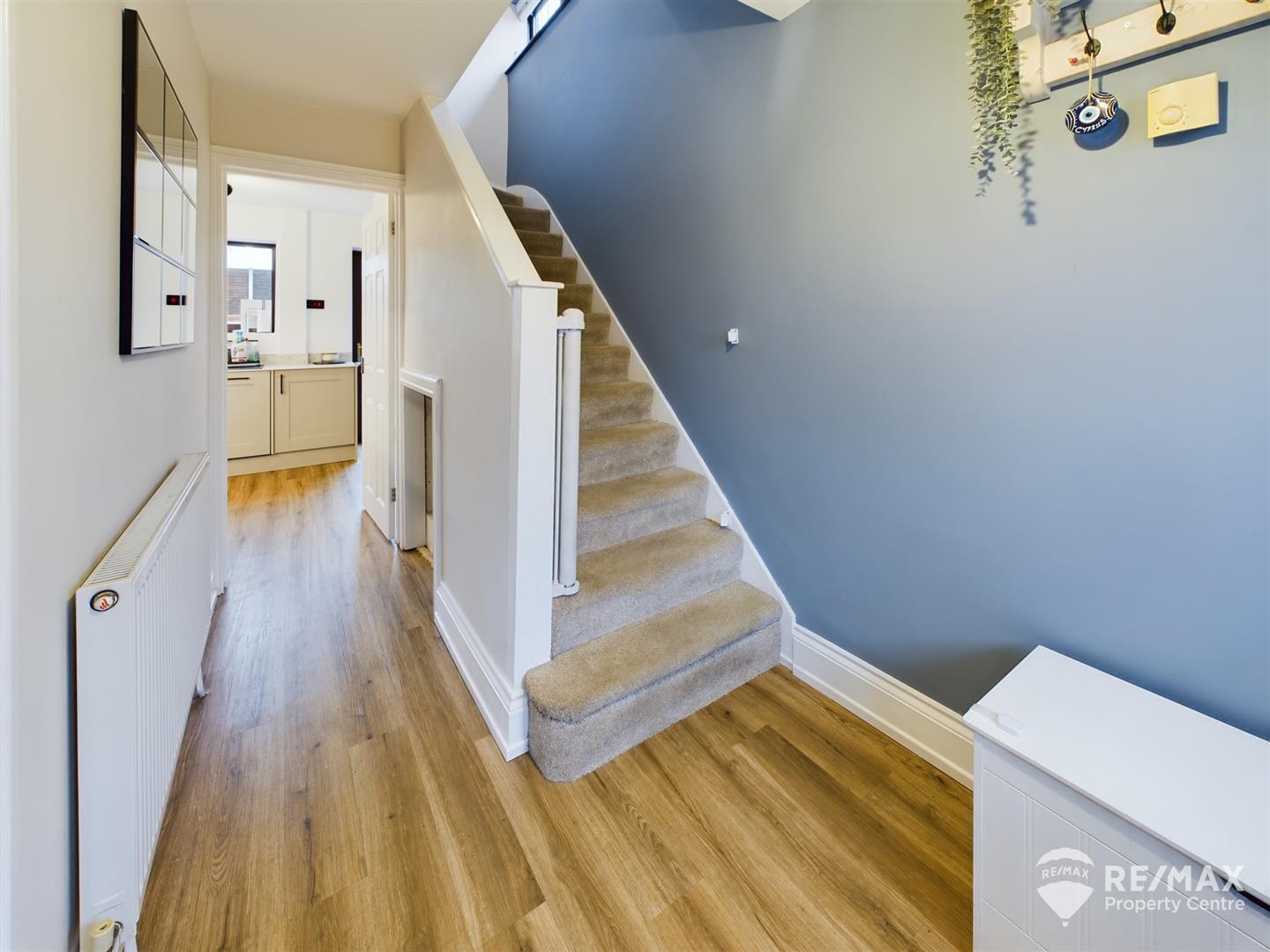 With under stairs storage cupboard, stairs to first floor and doors through to lounge/diner and kitchen