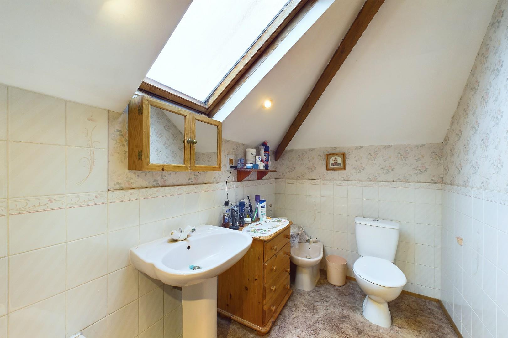With a door leading from the landing, corner bath, WC, hand wash basin and a double glazed skylight window to the ceiling