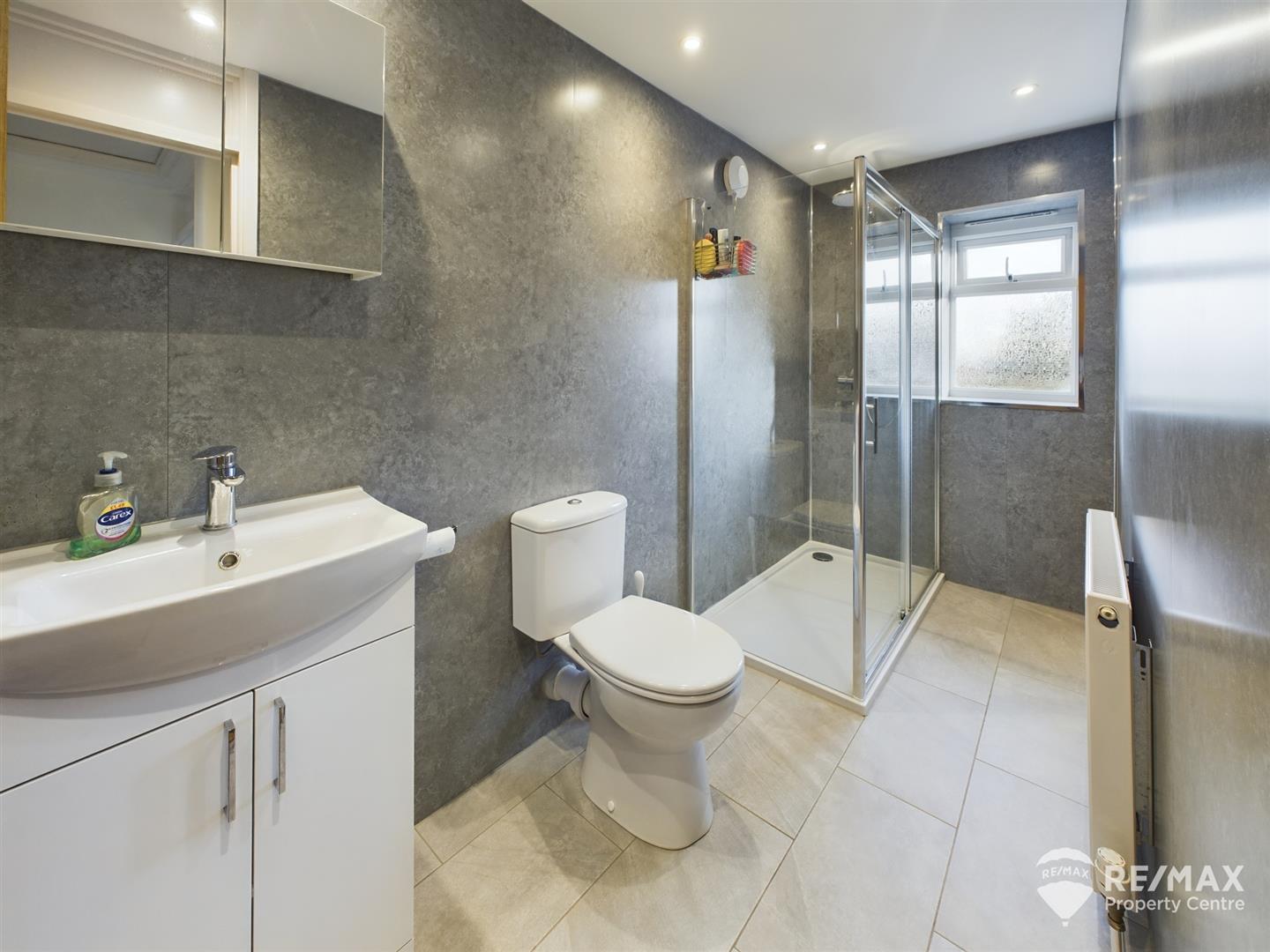 Walk in Double Shower, wash basin in vanity unit, low level WC and window to front aspect