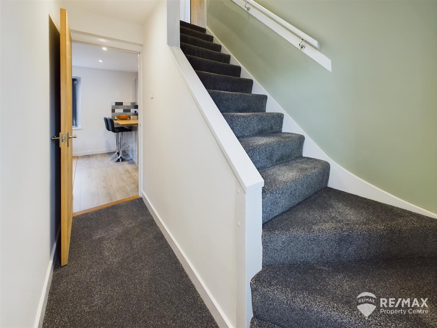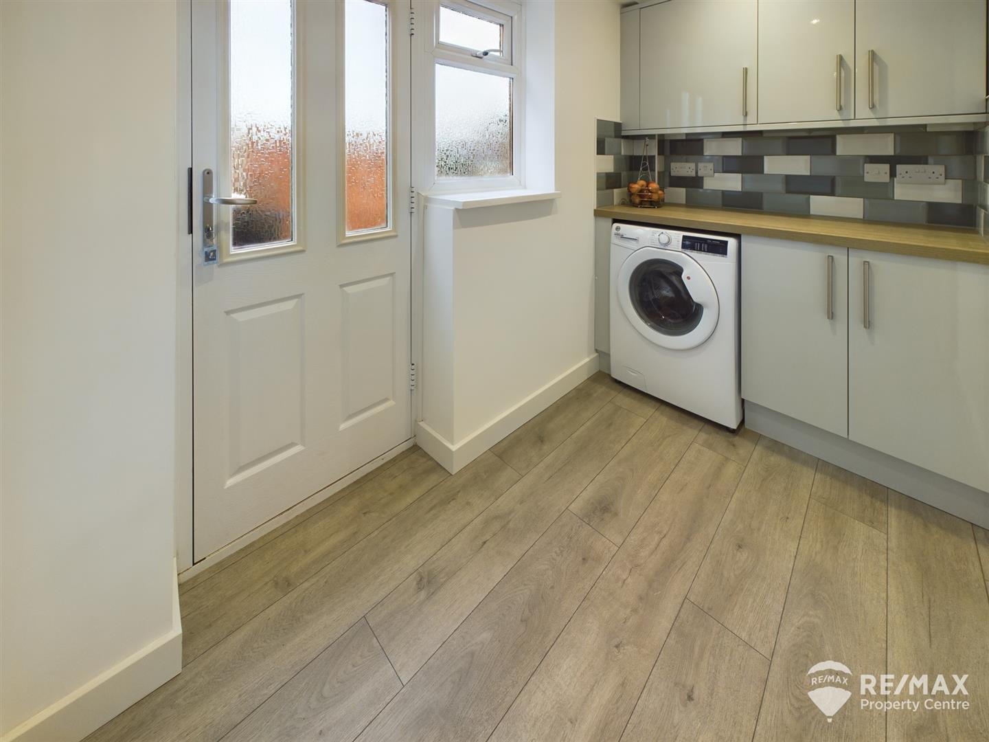 Fitted with wall and base units, complimentary wall tiling, plumbing and space for washing machine, understairs storage cupboard, with double glazed window and door to side aspect