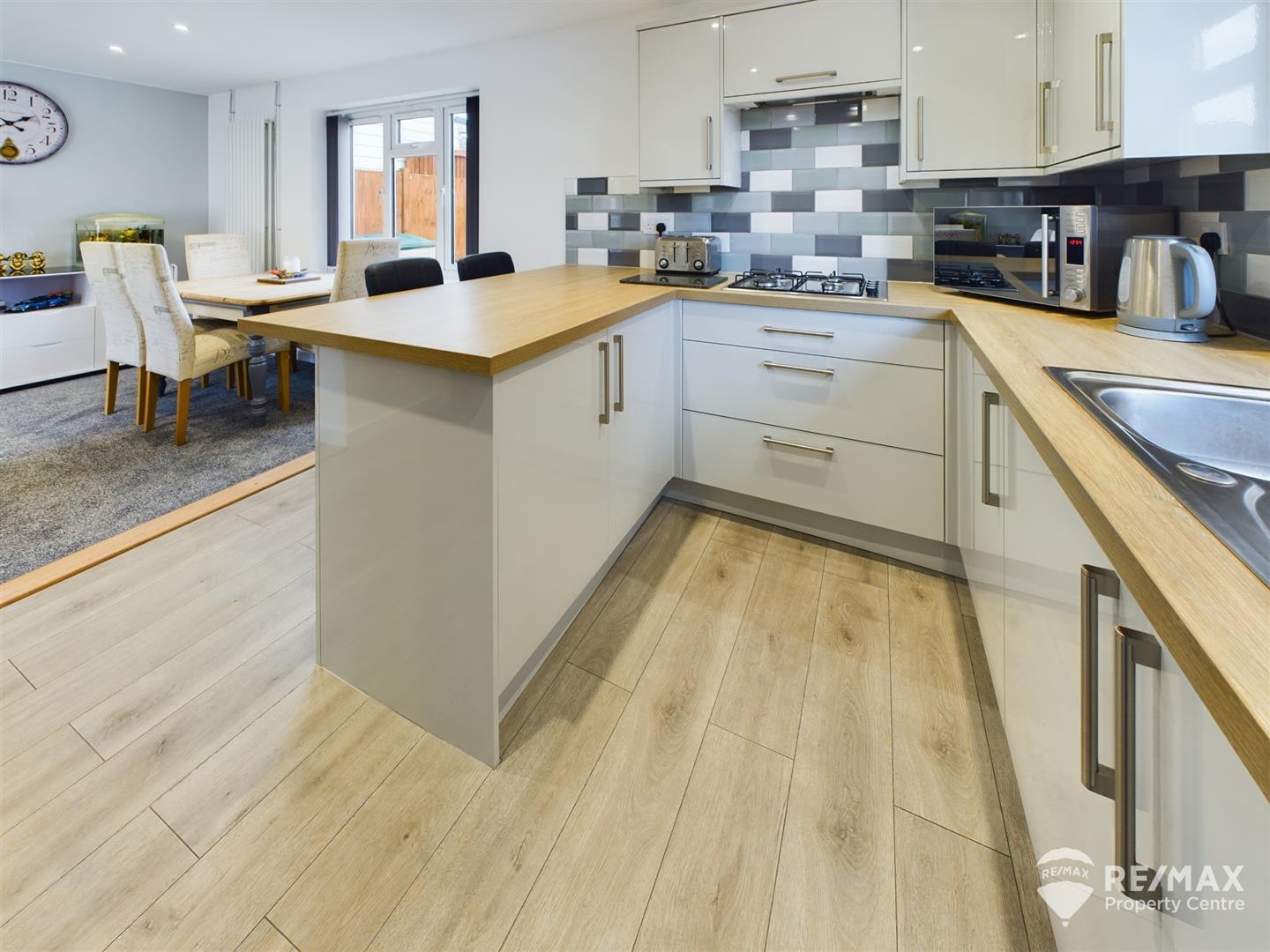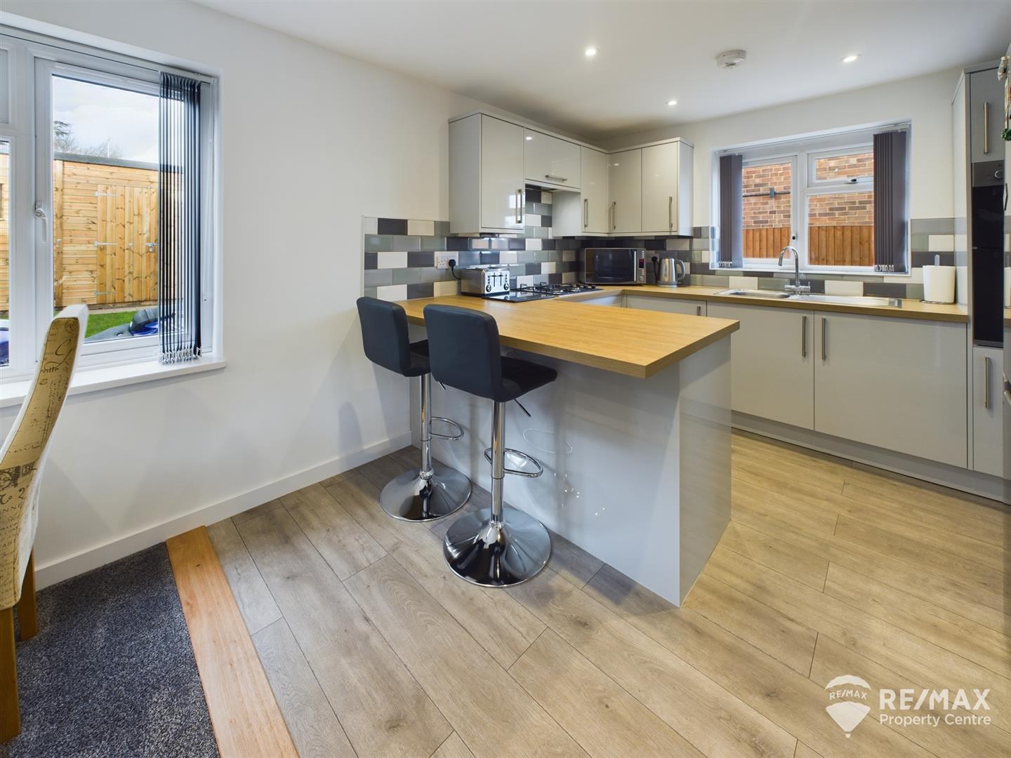 ** Newly fitted kitchen ** with a range of modern wall and base units, stainless steel sink/drainer with mixer tap, built in cooker, hob and extractor hood, space for fridge/freezer, complimentary tiling, wooden worktops and an island style breakfast bar for extra seating, with window to side aspect and door leading to the utility area
