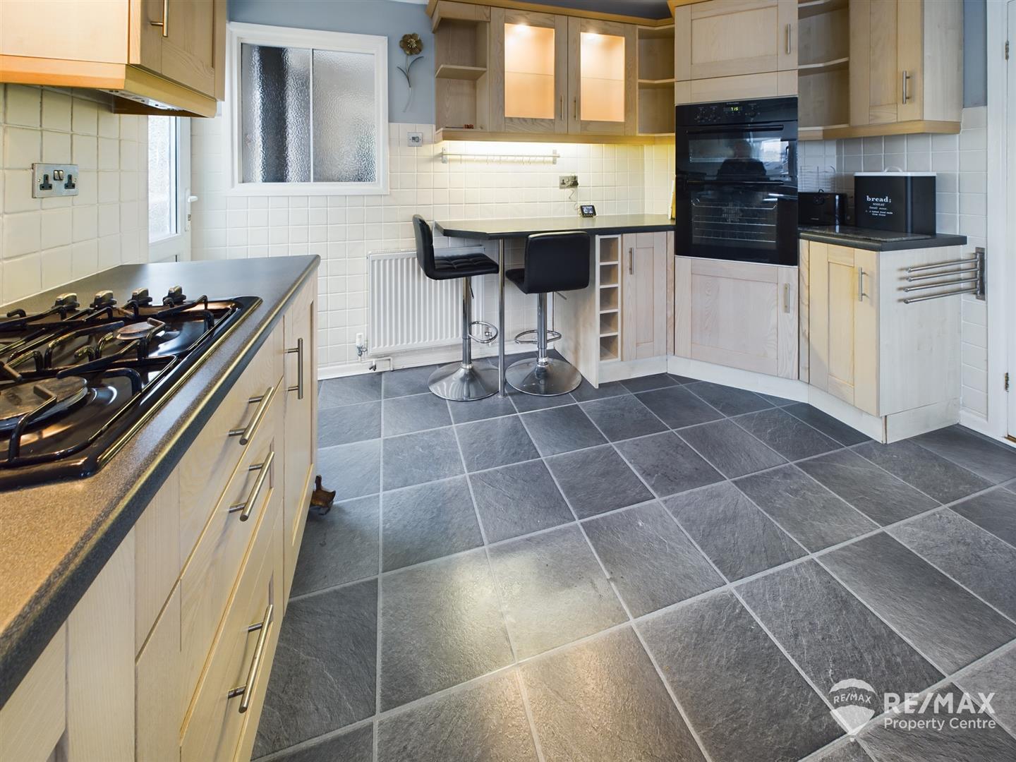 Fitted with a range of wall and base units, breakfast bar, built in oven, gas hob with extractor hood, one and a half bowl stainless steel sink/drainer, integrated dishwasher, built in wine rack, space and plumbing for washing machine, window to front aspect and door to side