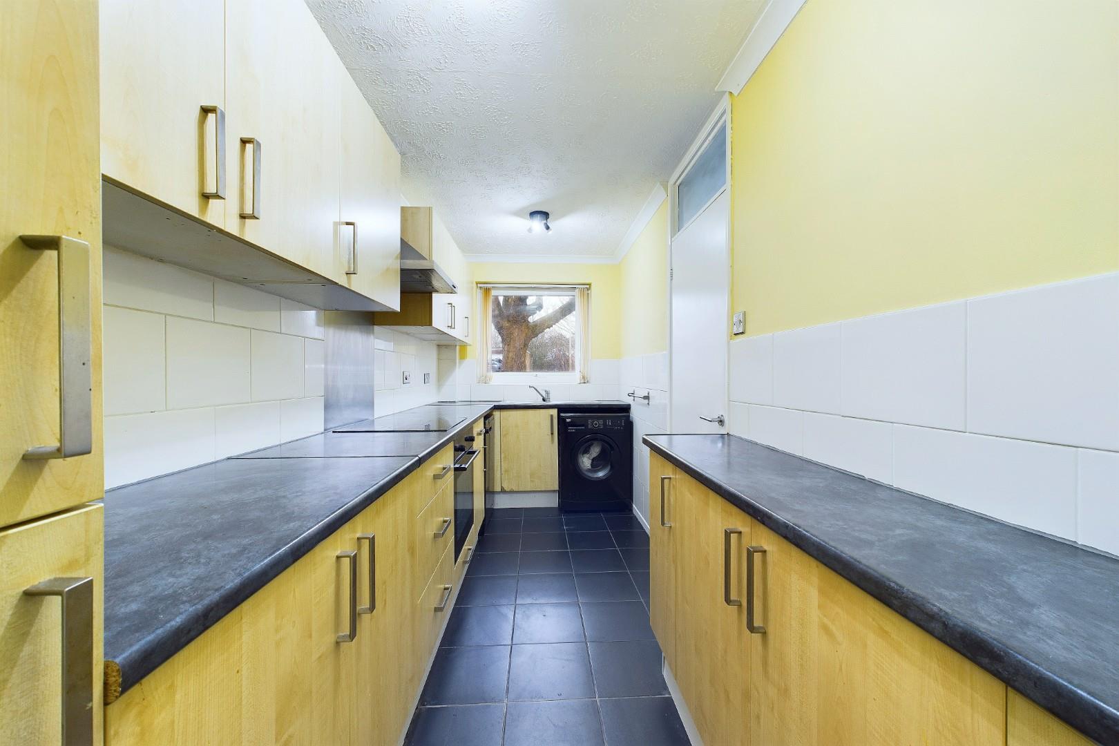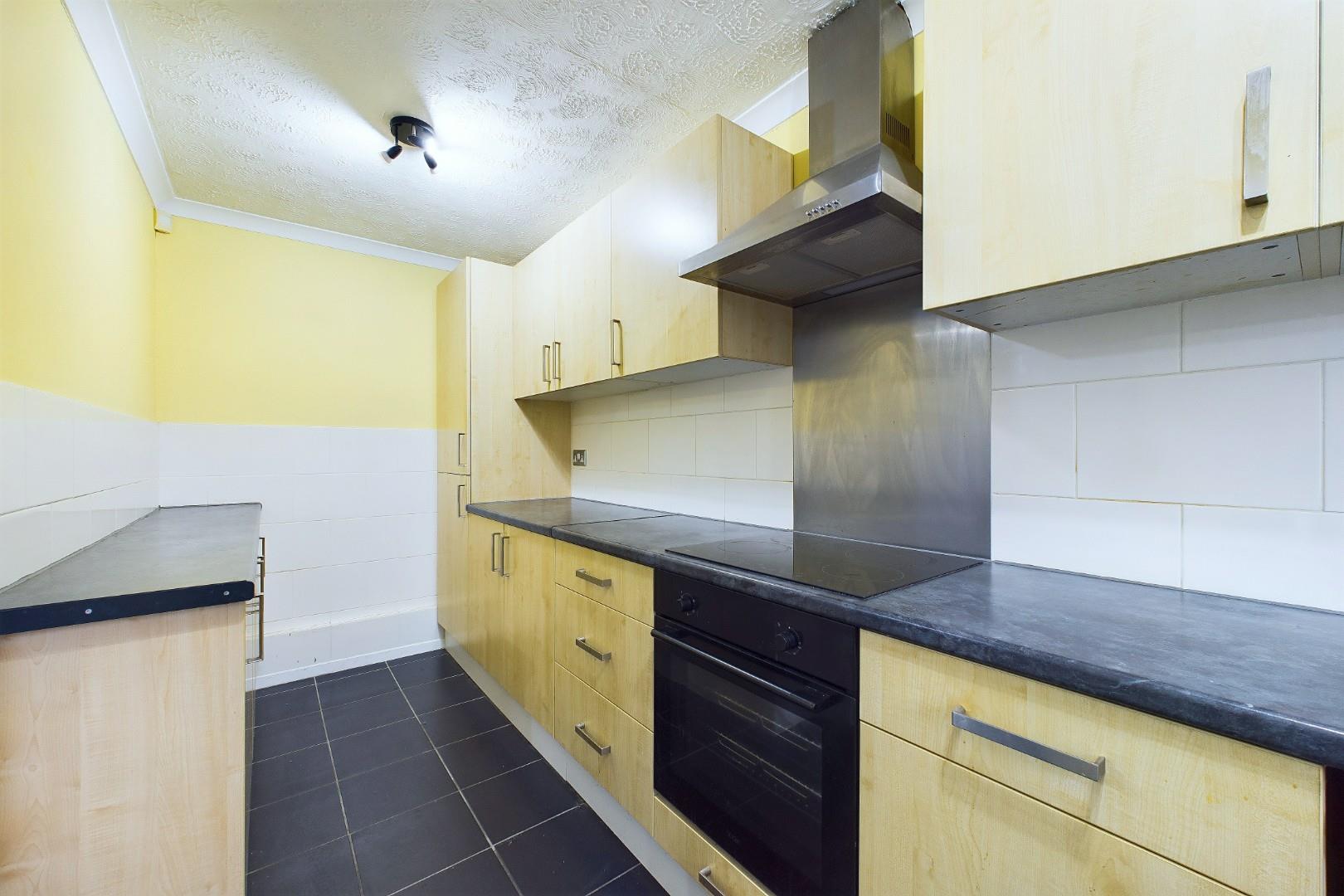 With a door leading from the lounge, fitted with a range of wall and base units with worktops above, integrated oven and electric hob with extractor hood above, composite sink with mixer tap and a double glazed window to the front.