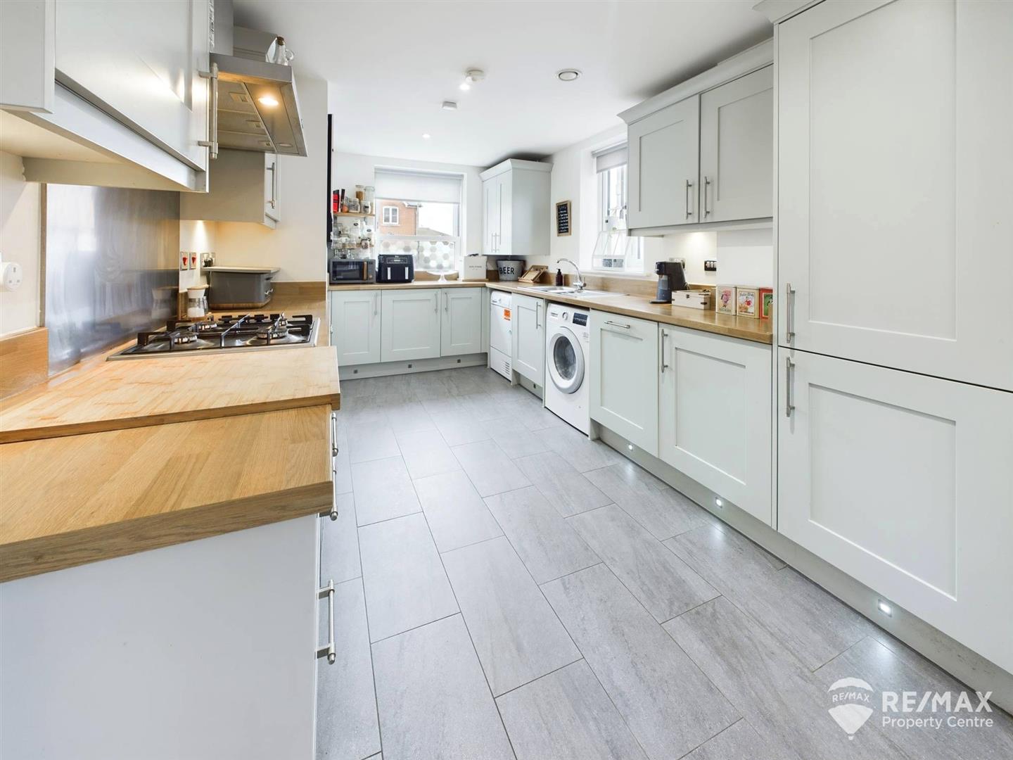 Fitted with a modern range of wall and base units, wooden worktops, integrated fridge, freezer, spaces for washing machine and tumble dryer, built in electric oven with extractor hood and stainless steel splash back, gas hob, cupboard housing boiler, windows to side and rear aspect