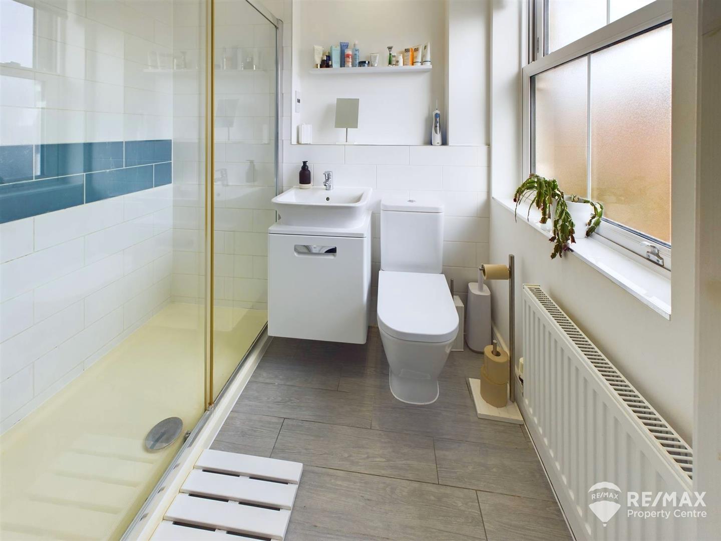 Suite comprising double shower, low level WC, wash basin, extractor fan and opaque window to front aspect