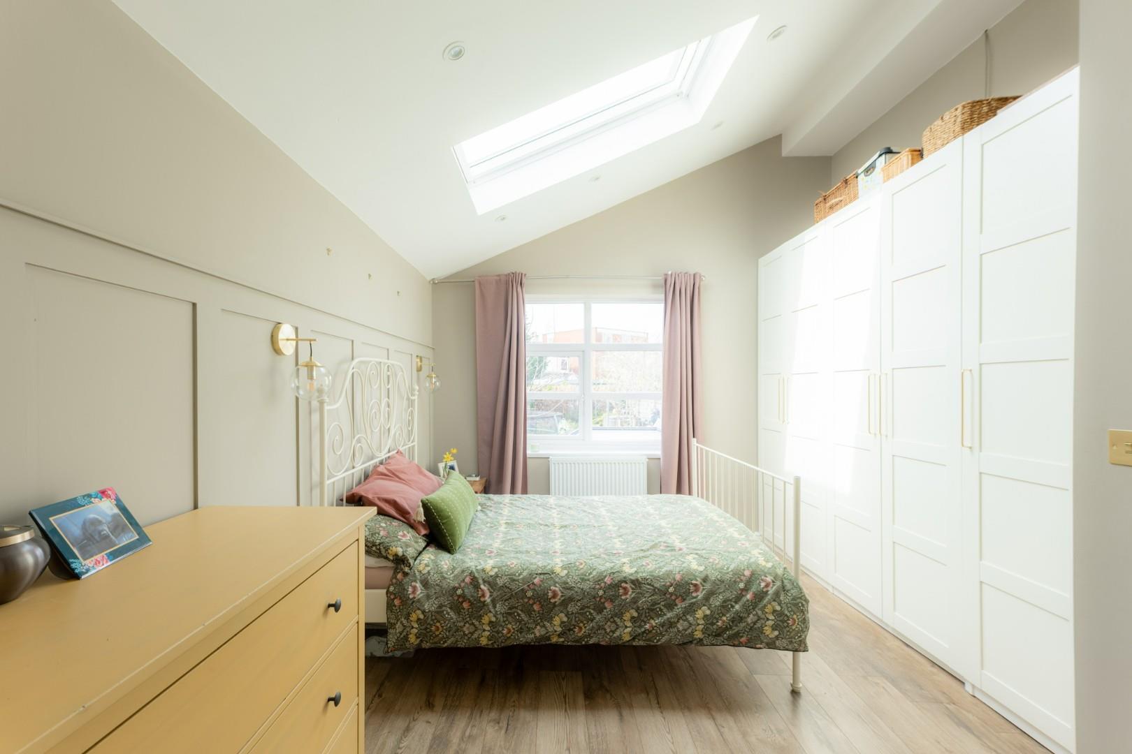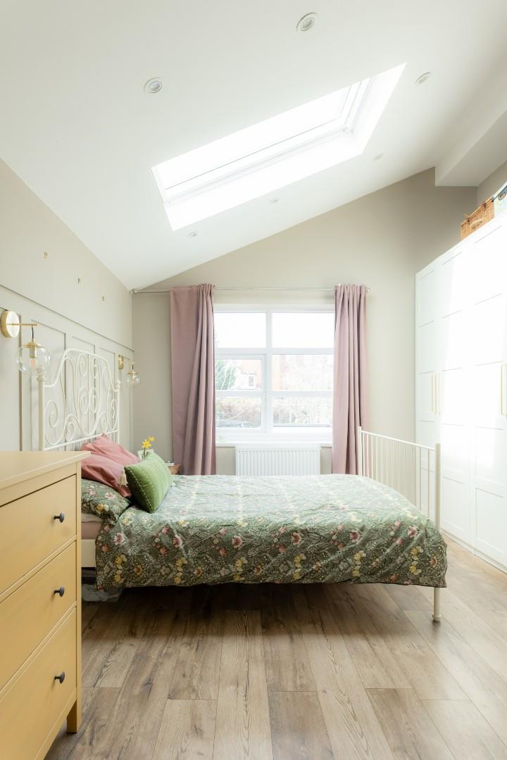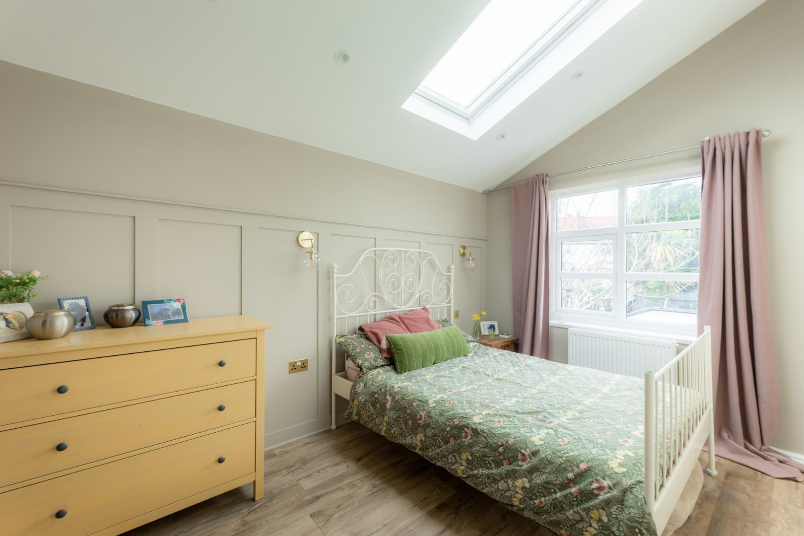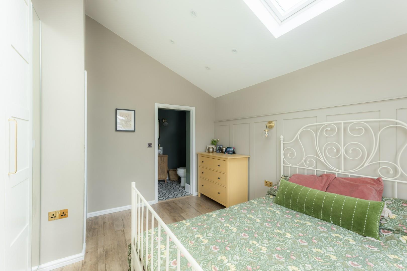 With a door leading from the landing, a door leading to the en-suite, a double glazed window to the rear, a double glazed skylight window to the ceiling and a central heating radiator