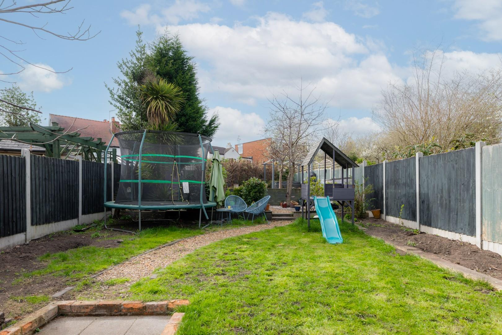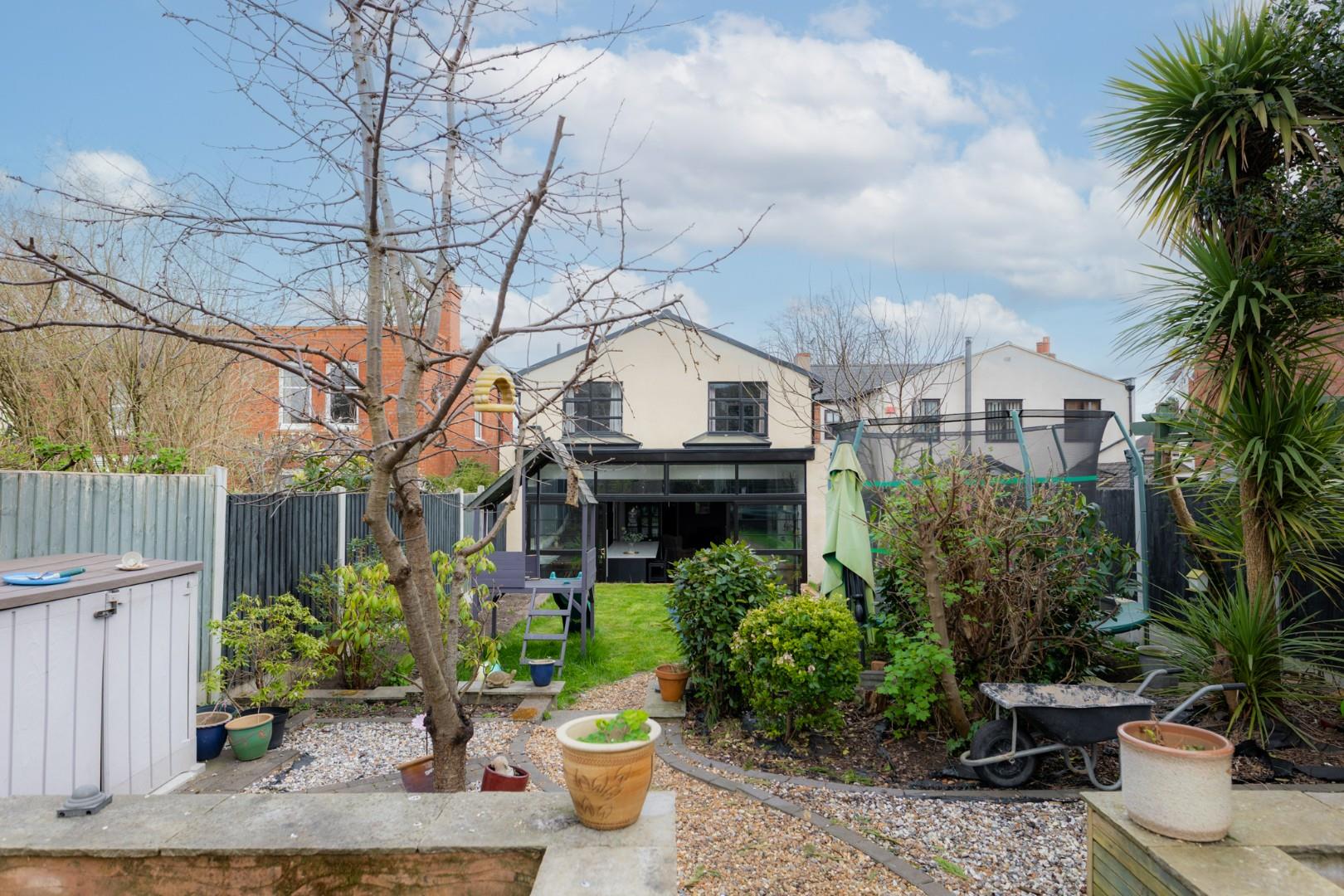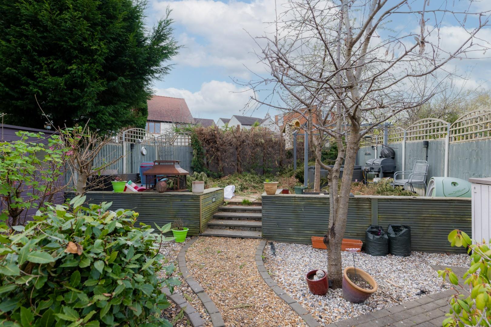 With doors leading from the kitchen, the garden is split into different levels with gravel area to the front, steps to lawn beyond with a further seating area to the rear, side access gate offering access to the front of the property
