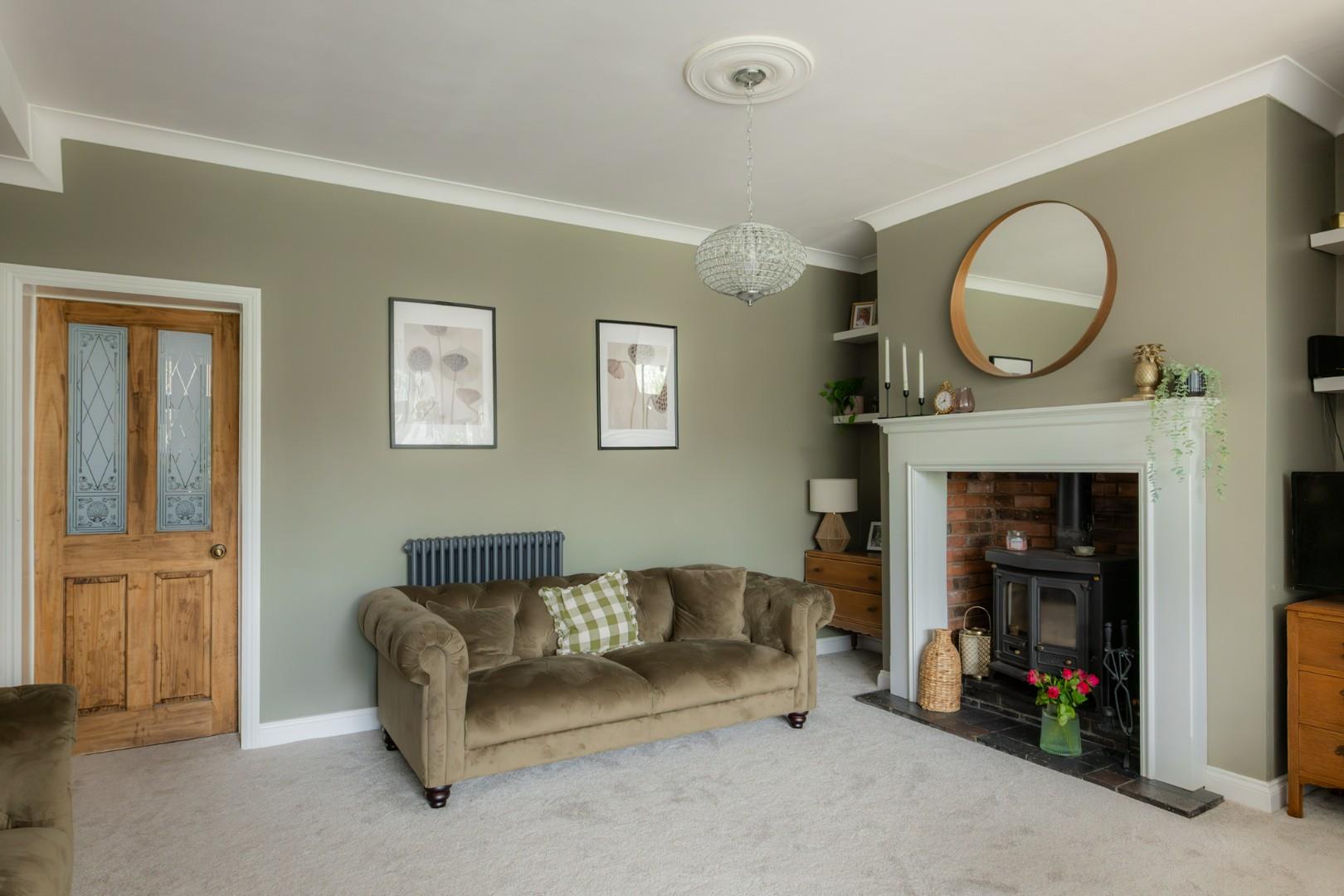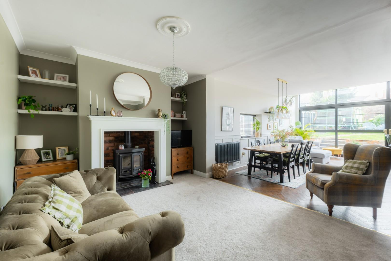With a door leading from the entrance hall, being open plan to the kitchen diner, a log burning stove with hearth and a central heating radiator