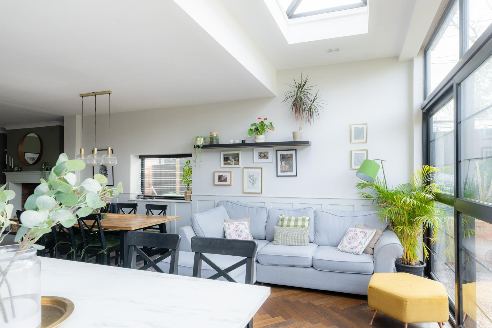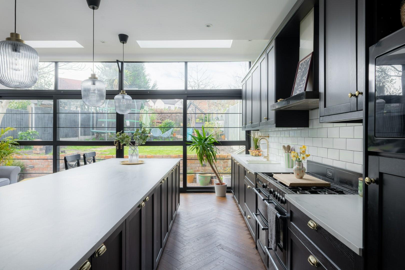 Being open plan to the living room, fitted with a range of wall and base units with worktops, integrated appliances, undermounted sink with mixer tap, breakfast island with worktops and storage, full height double glazed sliding doors to the rear, double glazed lantern style windows to the ceiling and a central heating radiator