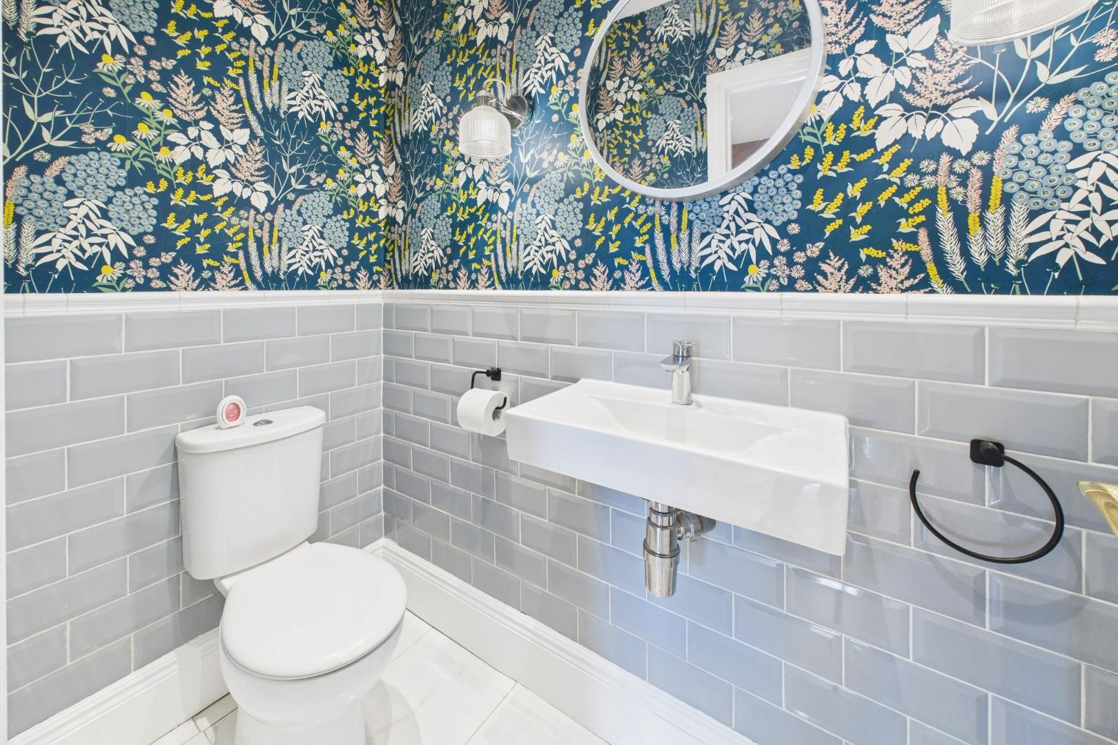 With a door leading from the utility, half height tile surround, hand wash basin, WC and a central heating radiator