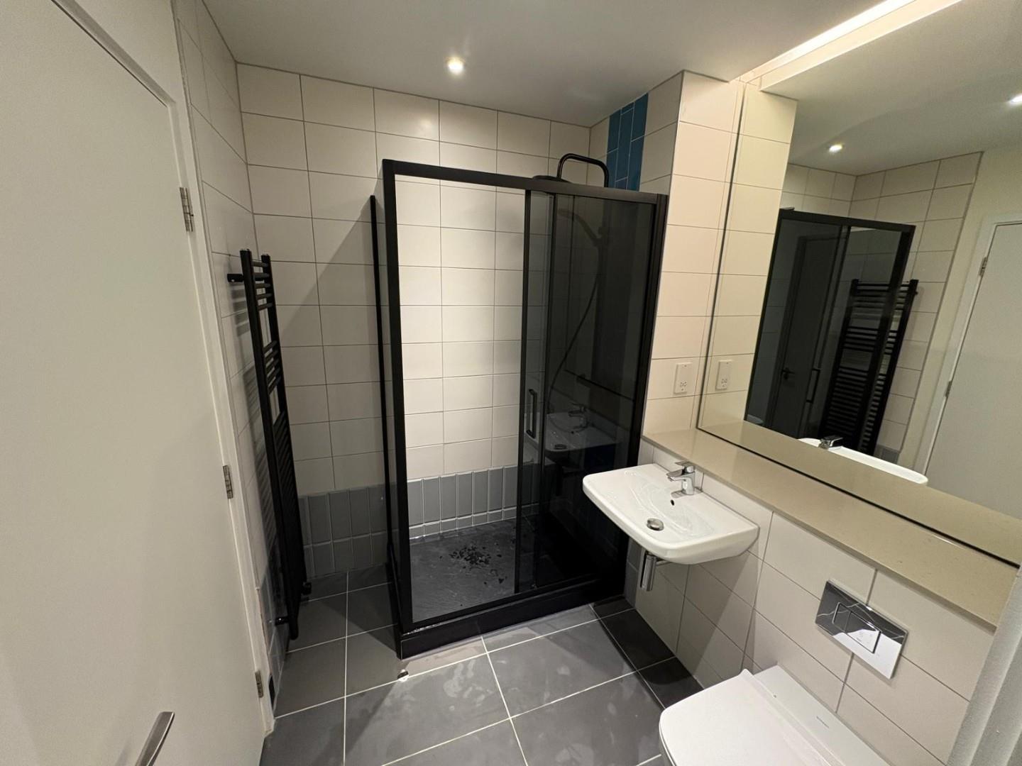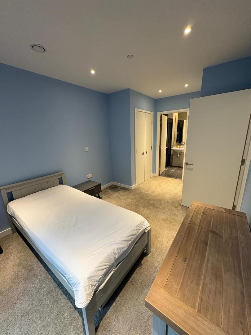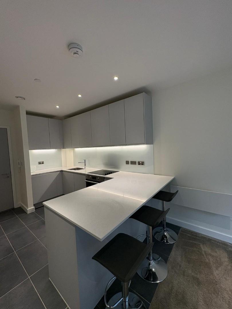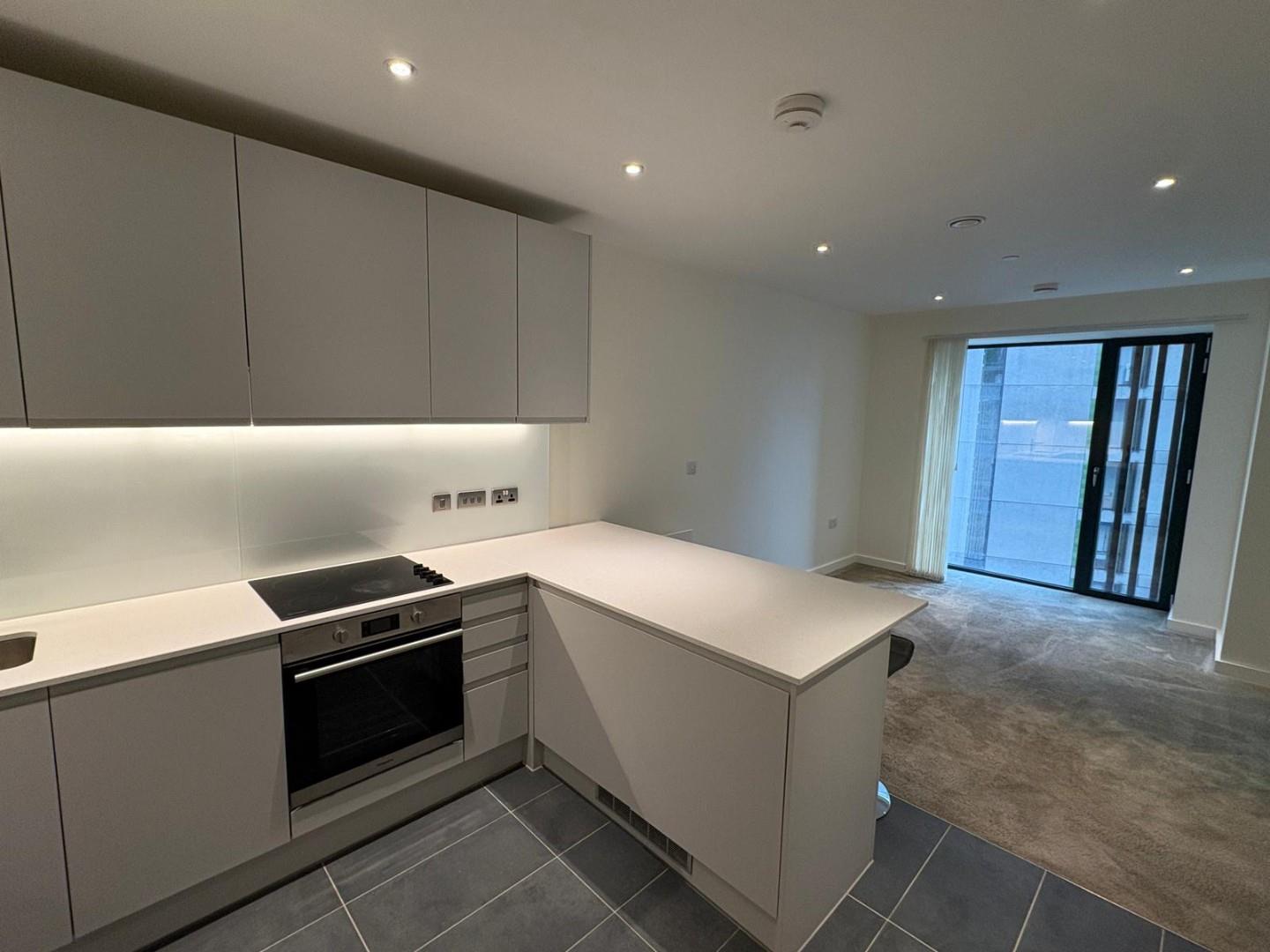 The property offers a spacious open-plan living and kitchen area with integrated appliances, providing a sleek and modern living space. The bedroom is a well-sized double with built-in wardrobe space, and the bathroom is a luxury suite with a bath and overhead shower.