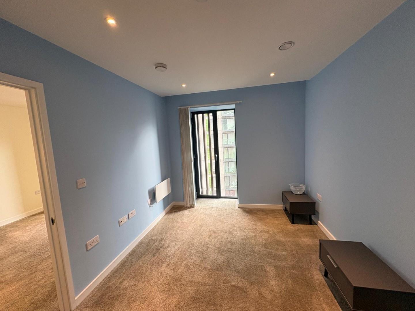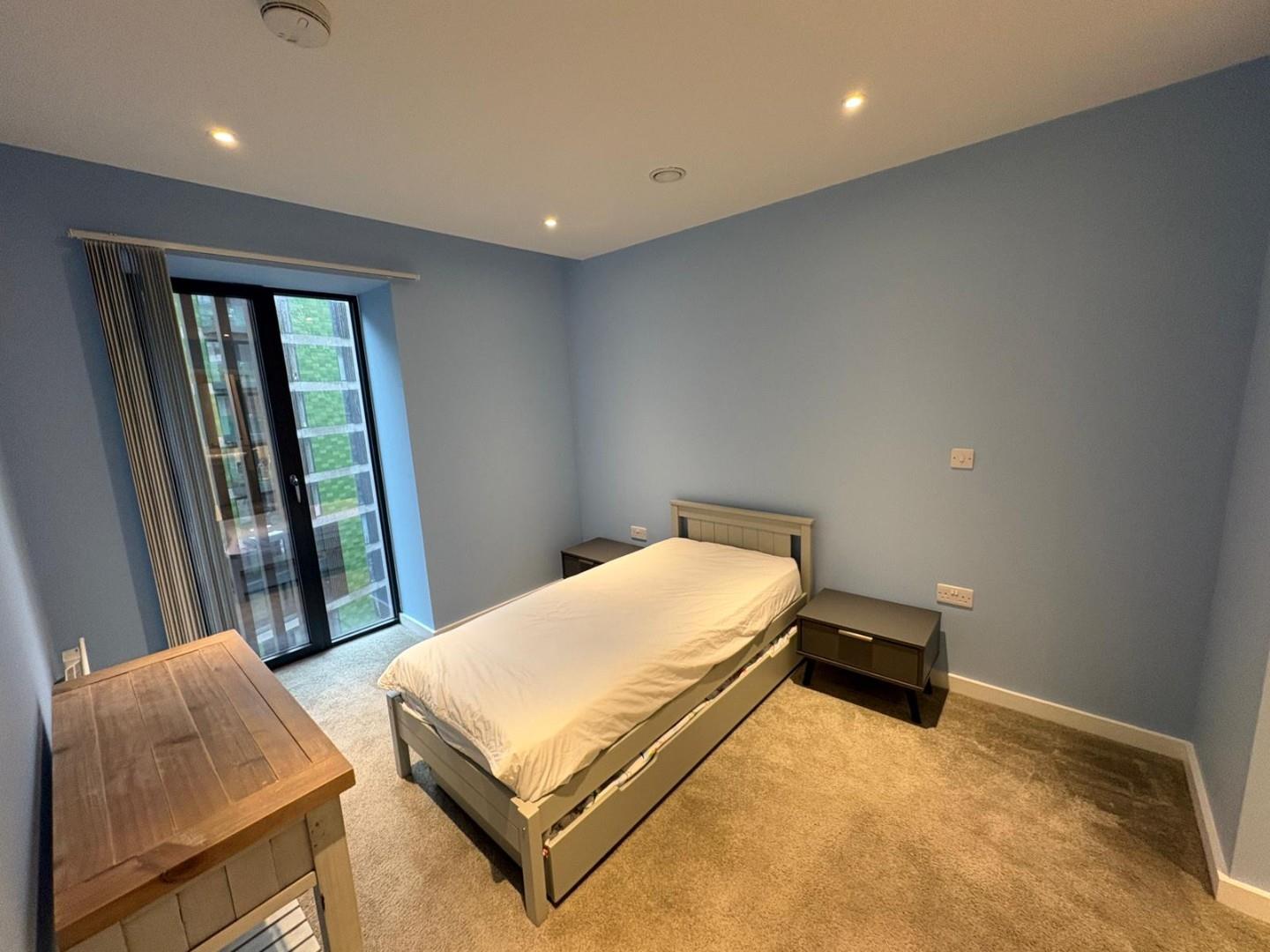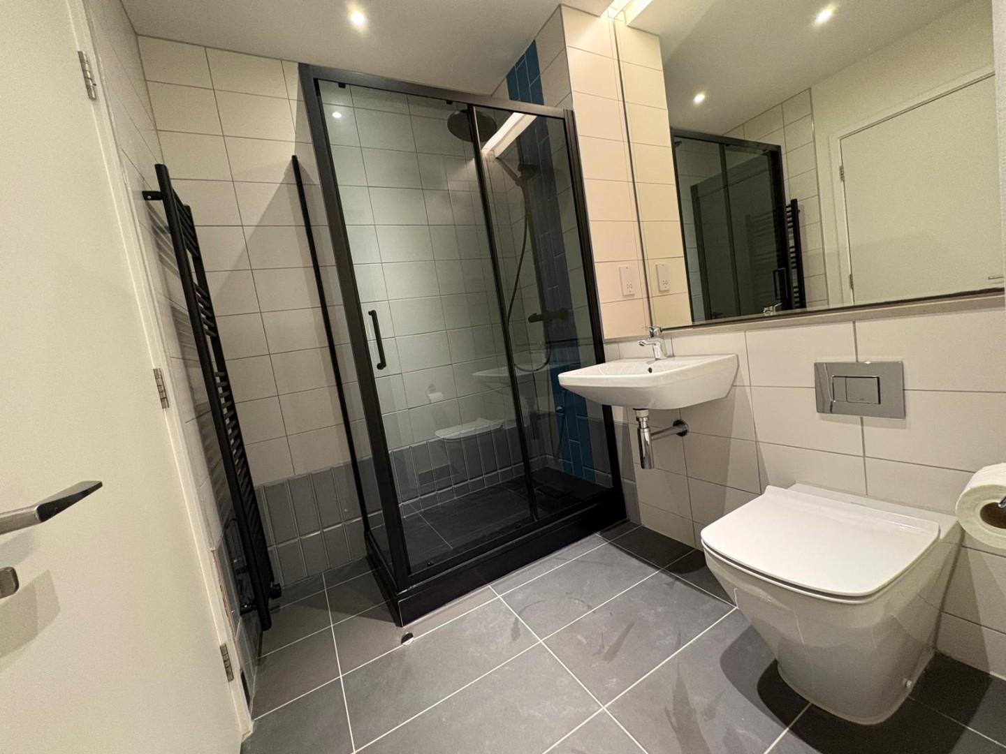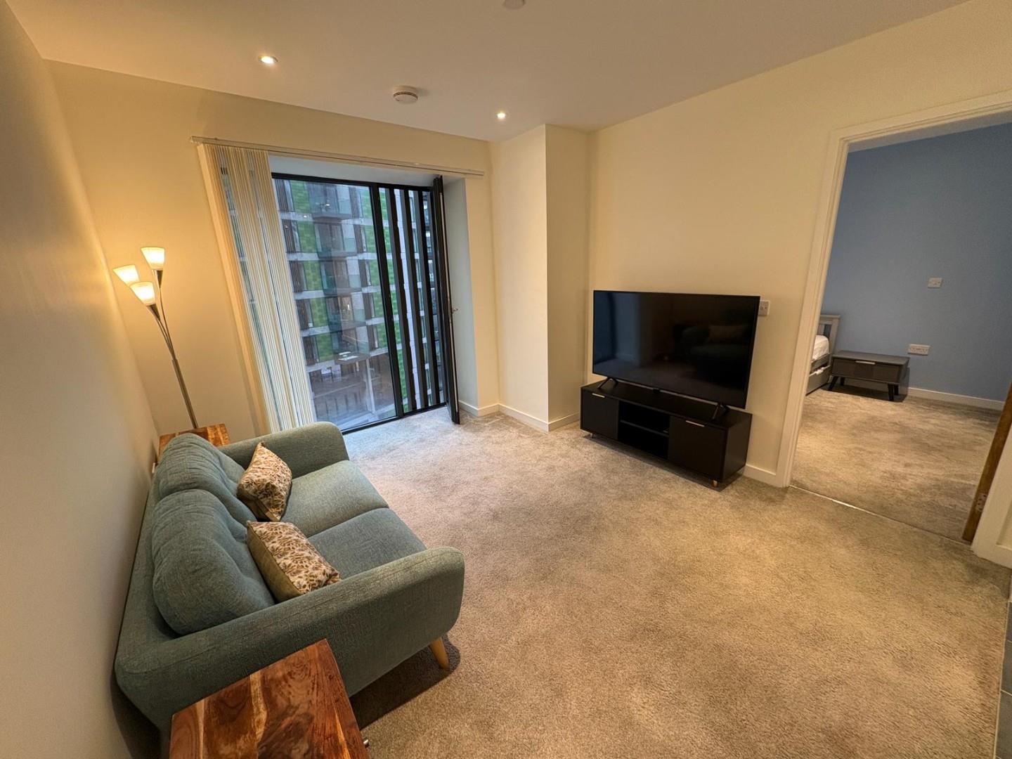 The property offers a spacious open-plan living and kitchen area with integrated appliances, providing a sleek and modern living space. The bedroom is a well-sized double with built-in wardrobe space, and the bathroom is a luxury suite with a bath and overhead shower.