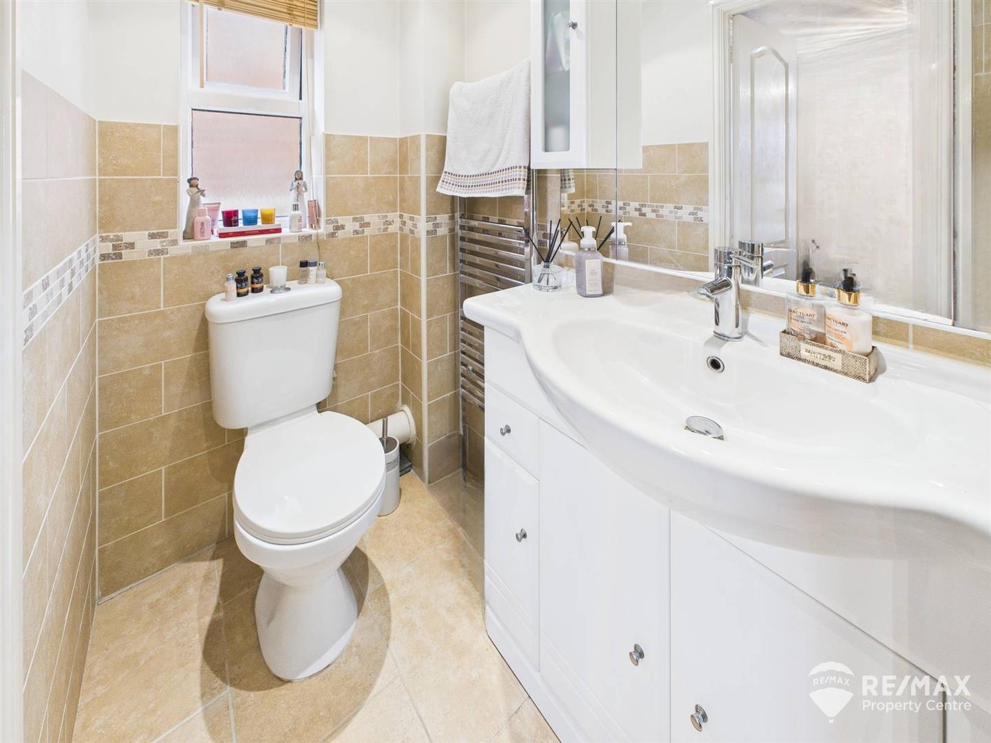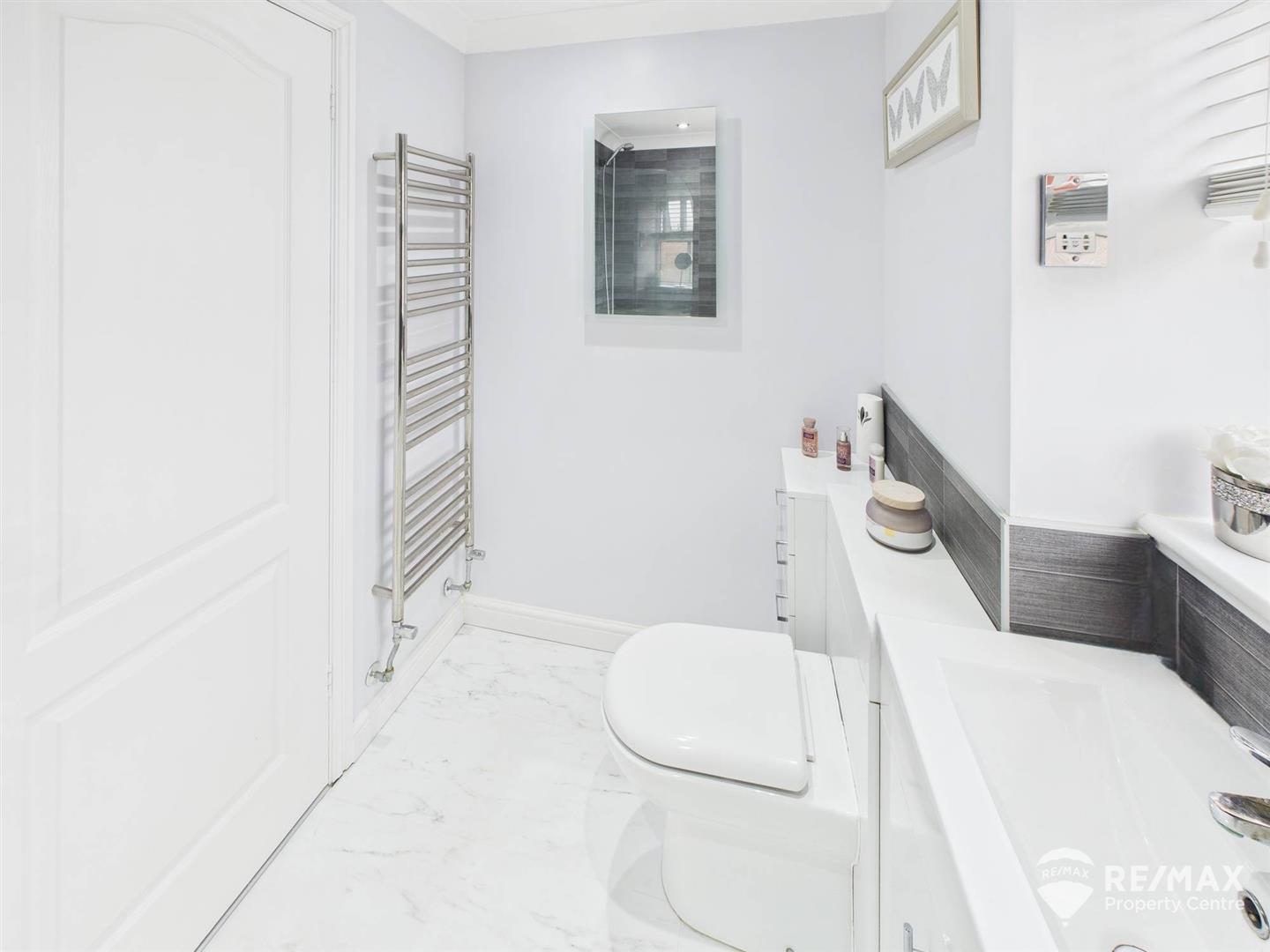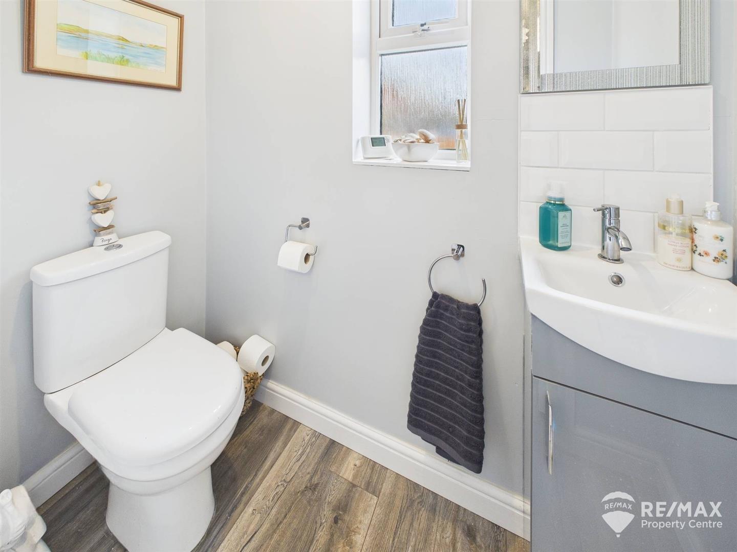 Low level WC, wash basin in vanity and opaque window to front aspect