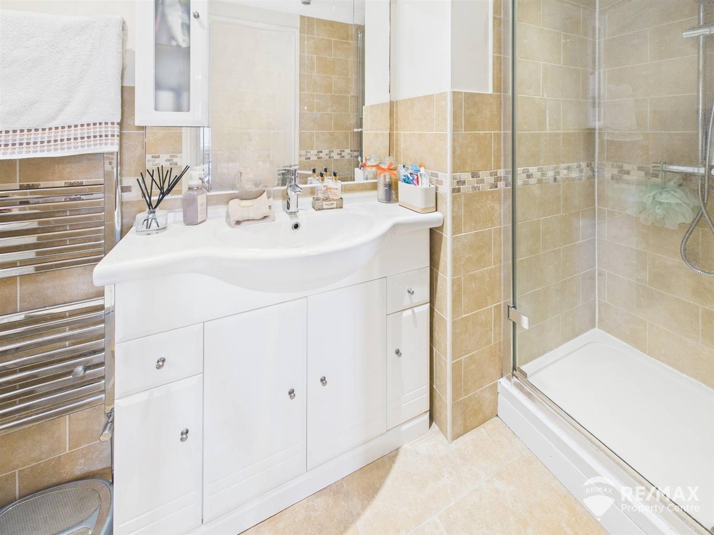 Suite comprising shower cubicle, sink in vanity unit, low level WC, heated towel radiator and opaque window to side aspect