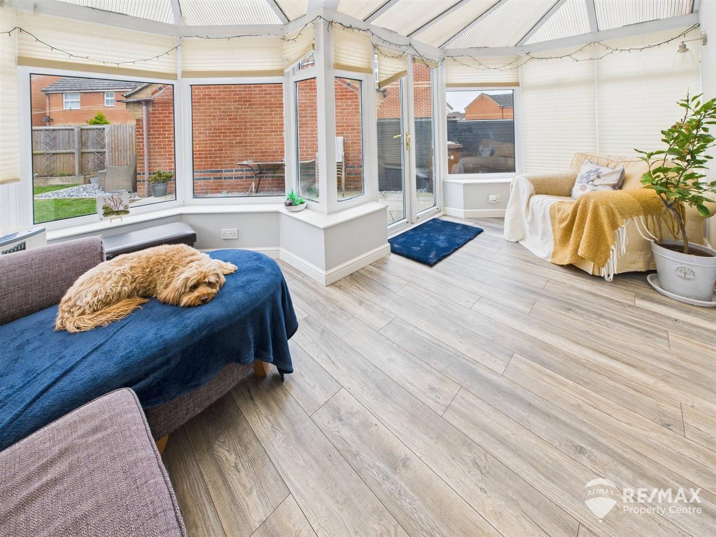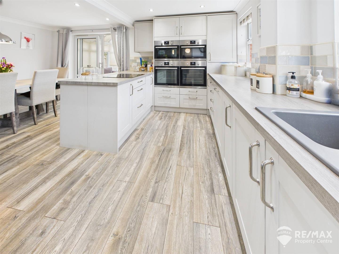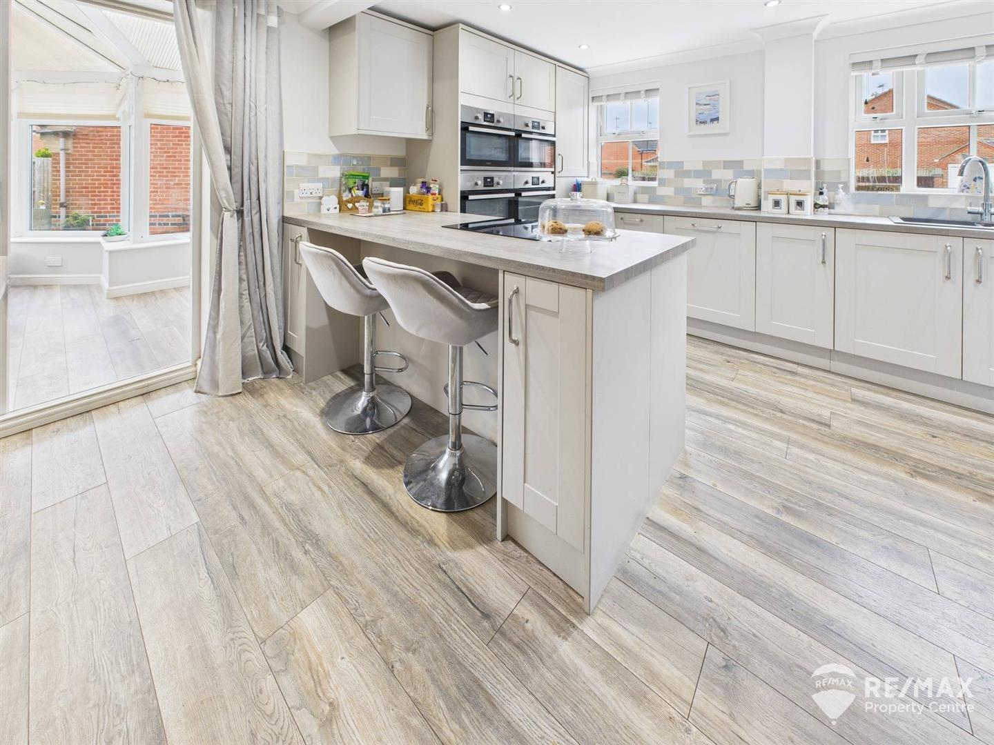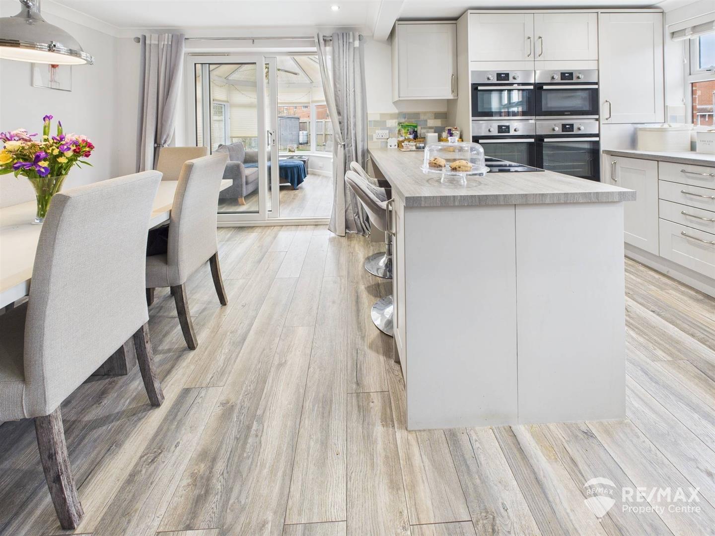 Fitted with a modern range of wall and base units, 2 fitted electric ovens with microwave & grill, induction hob set in breakfast bar with under counter space for bar stools, integrated dishwasher, integrated washing machine, space for fridge/freezer, complimentary wall tiling, 2 windows to side aspect and french doors to conservatory