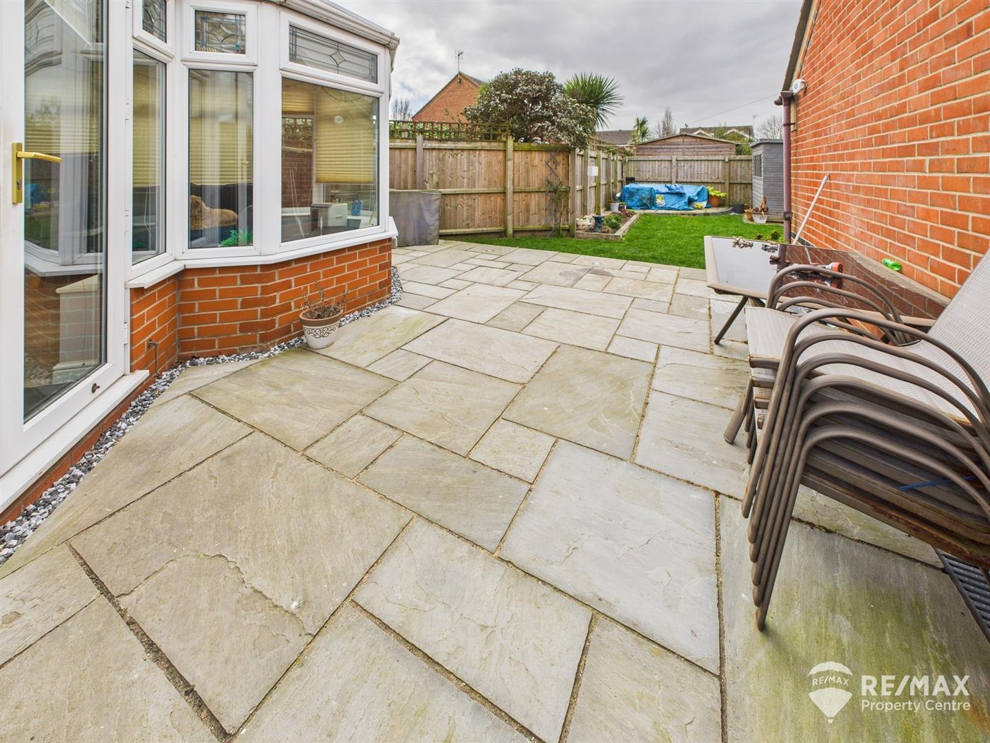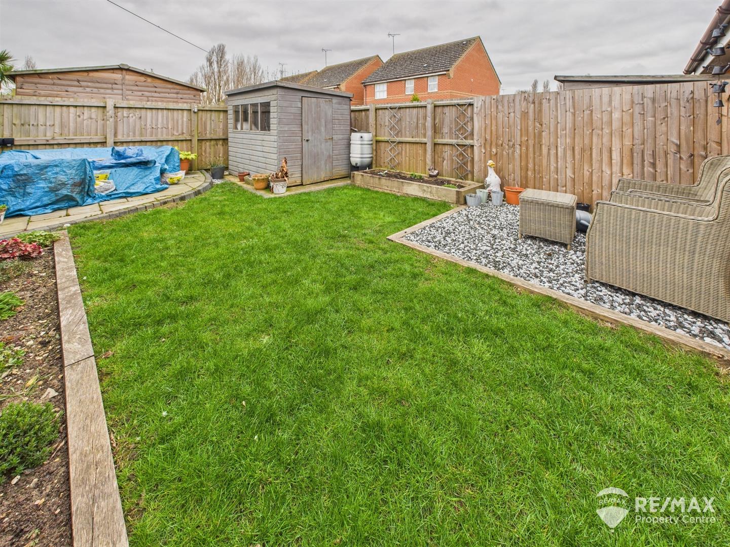The fully enclosed rear garden has a lawn and 2 patio areas to enjoy, decorative borders, wooden storage shed, South facing