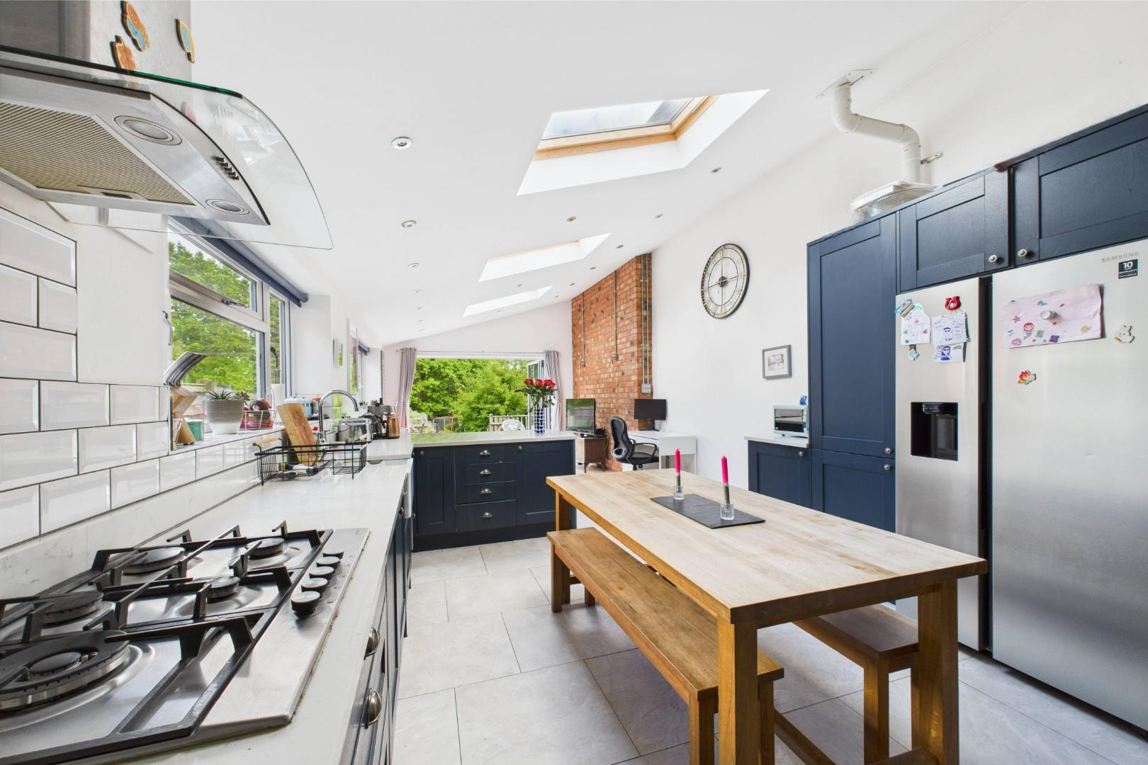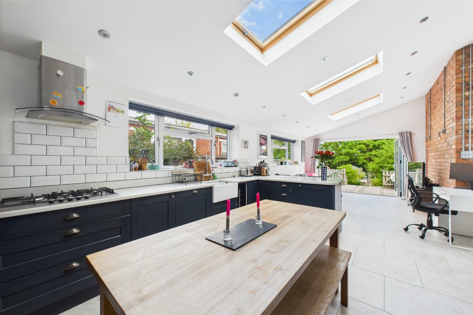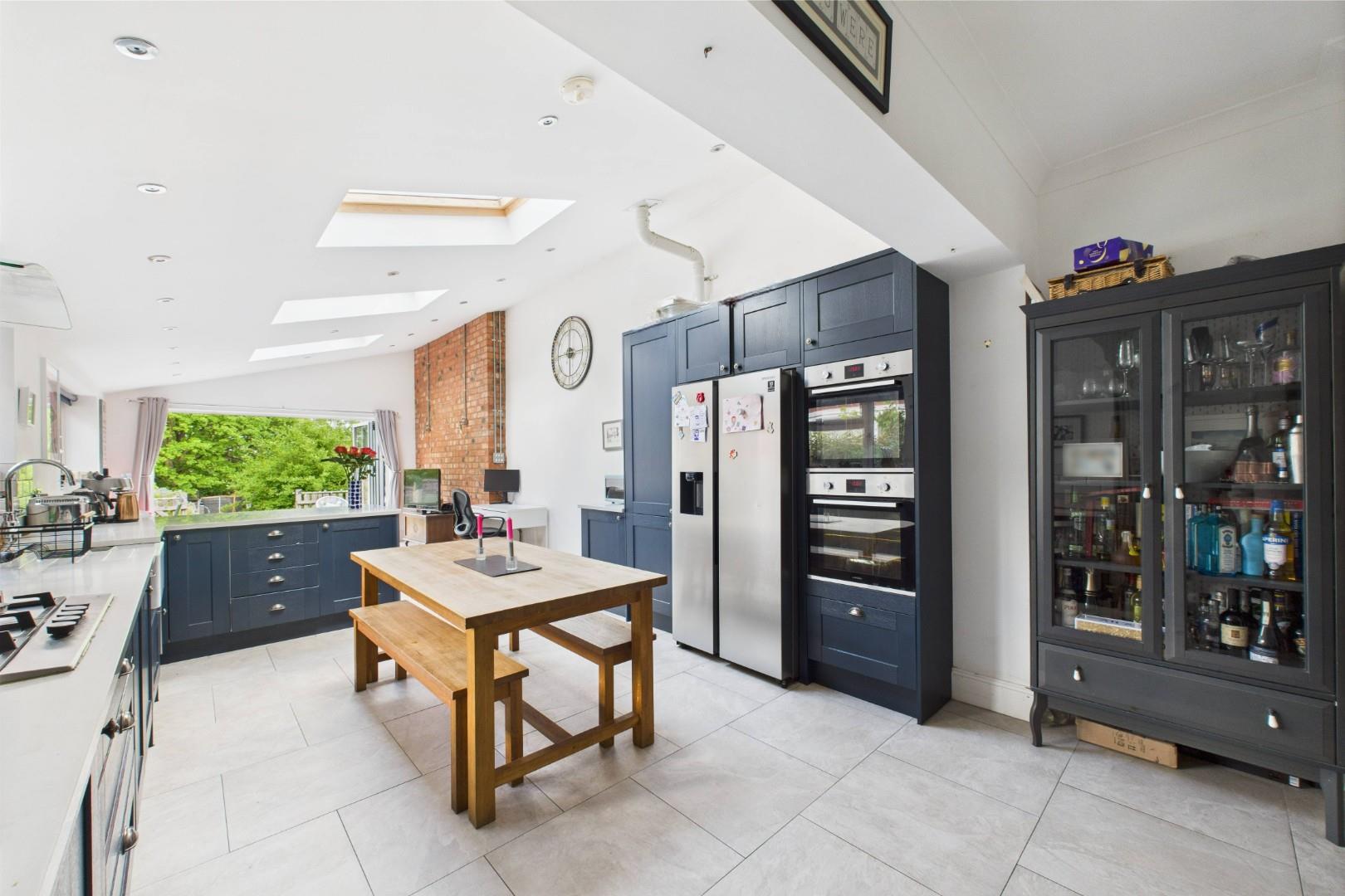 With a door leading from the entrance hall, open plan dining space to kitchen with wall and base units with 30mm Quartz worktops above, integrated appliances including double oven, gas burning hob with stainless steel extractor above, Belfast style sink with mixer tap and drainer grooves, breakfast peninsular with storage and seating, doors to the WC and utility, exposed brick feature wall, under-floor heating throughout, double glazed bi-folding doors to the rear garden, double glazed windows to the side and central heating radiators