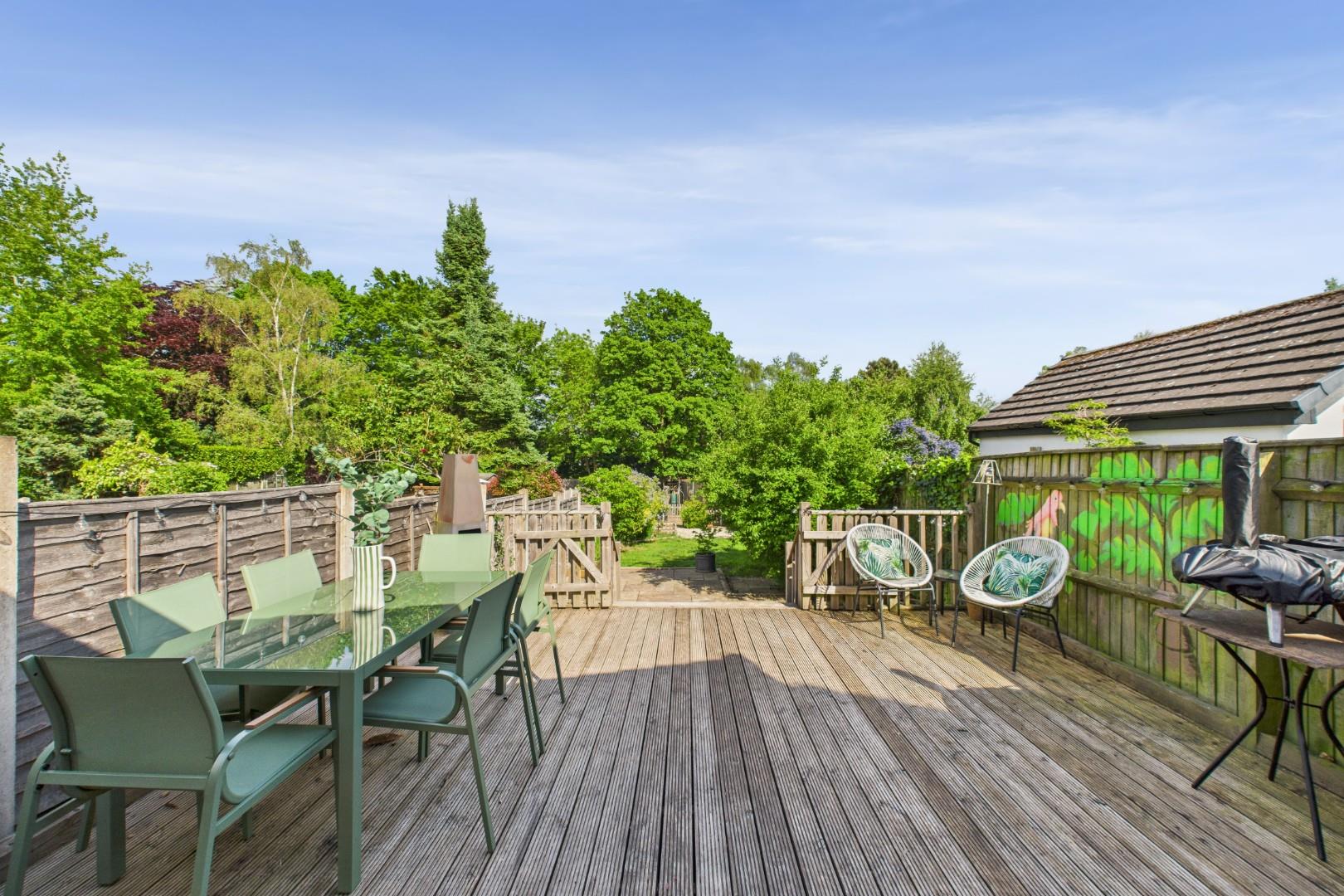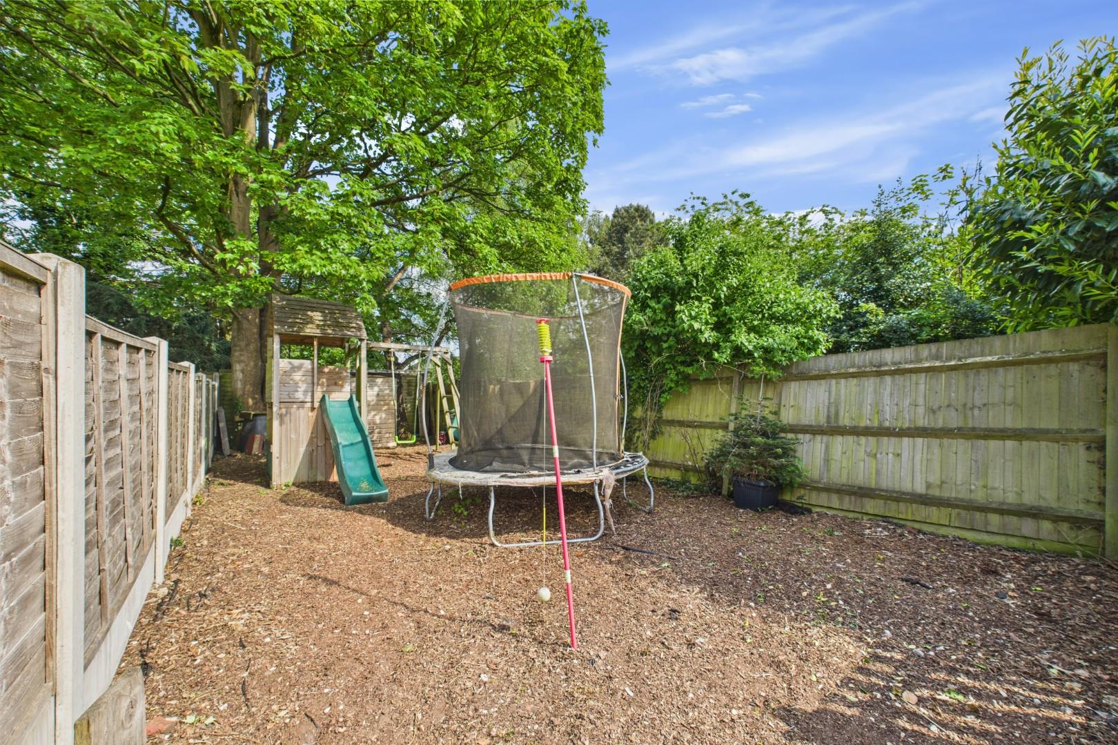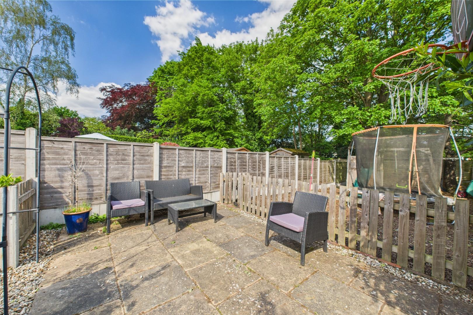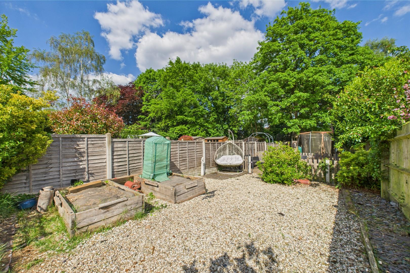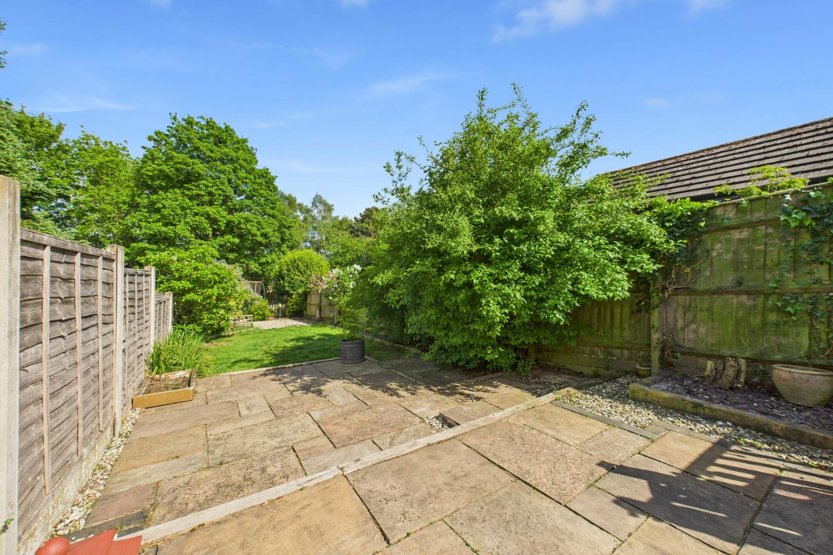 With bi-folding doors leading from the kitchen, patio area to the front with lawn beyond, further gravel area with fenced wood-chip area to the rear