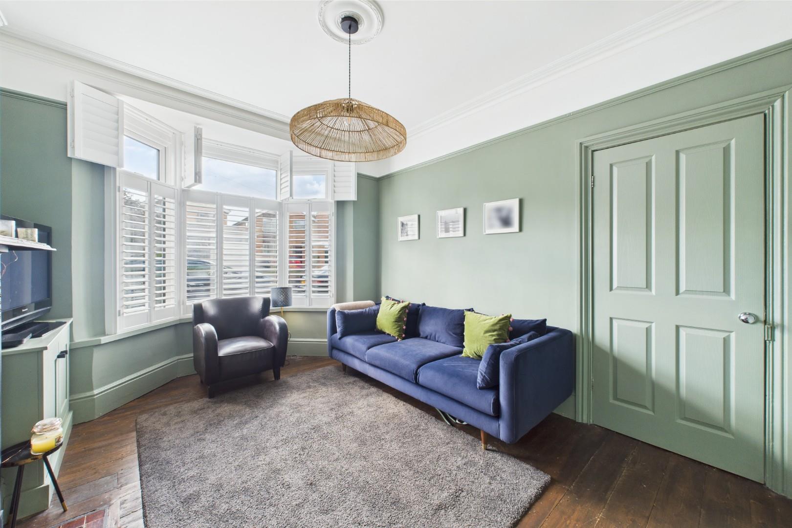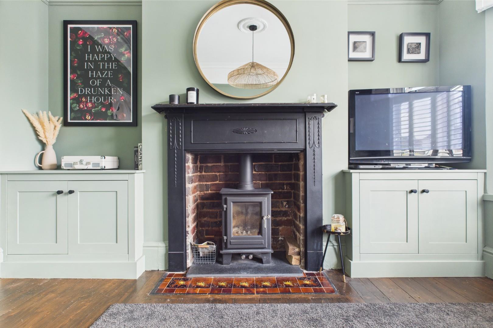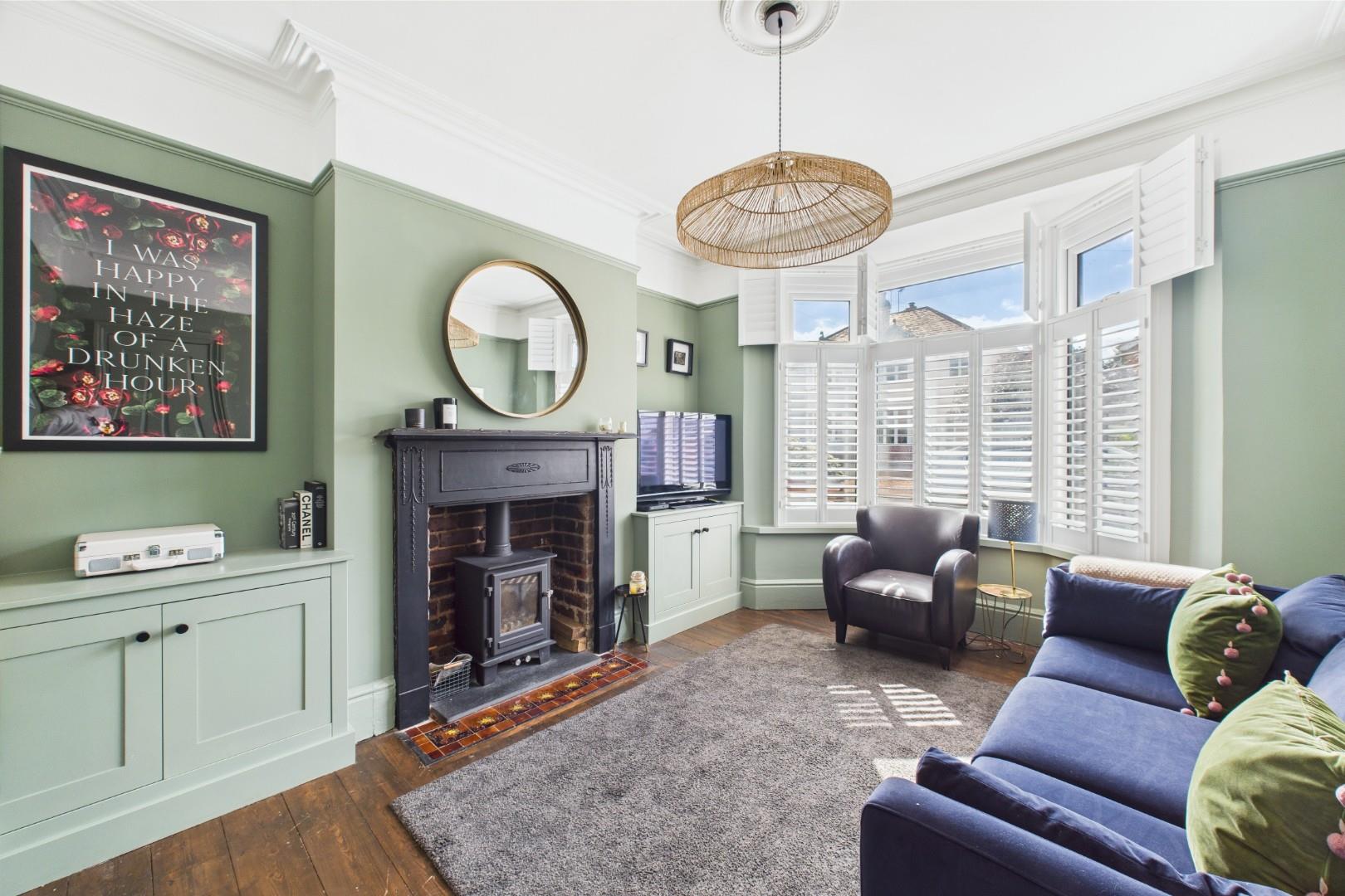 With a door leading from the entrance hall, restored original wood flooring, feature fireplace with log burning stove, traditional surround with hearth, built in alcove storage cupboards, traditional bay window with fitted hardwood shutters to the front and a central heating radiator