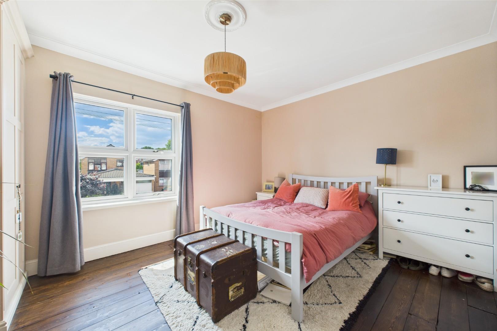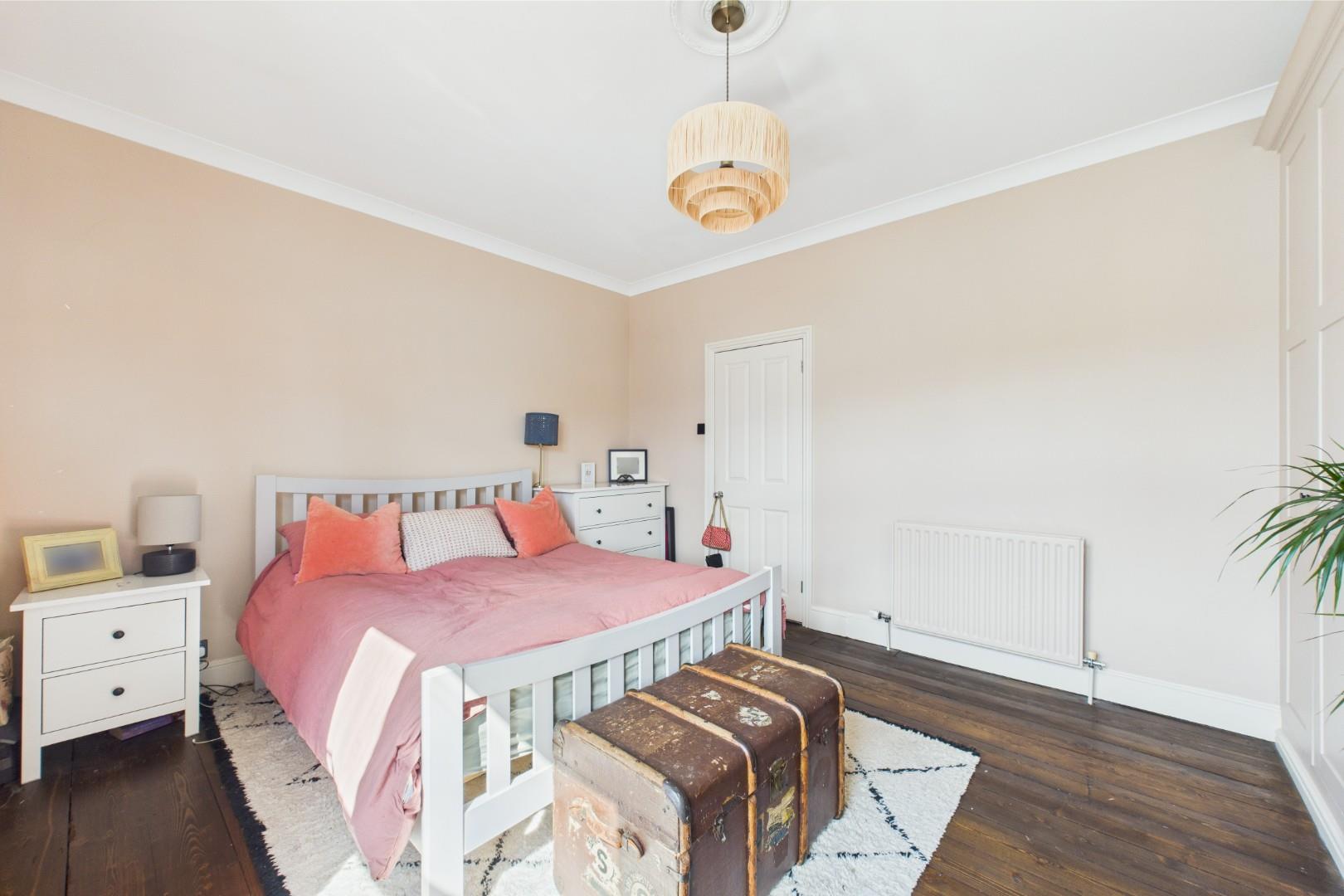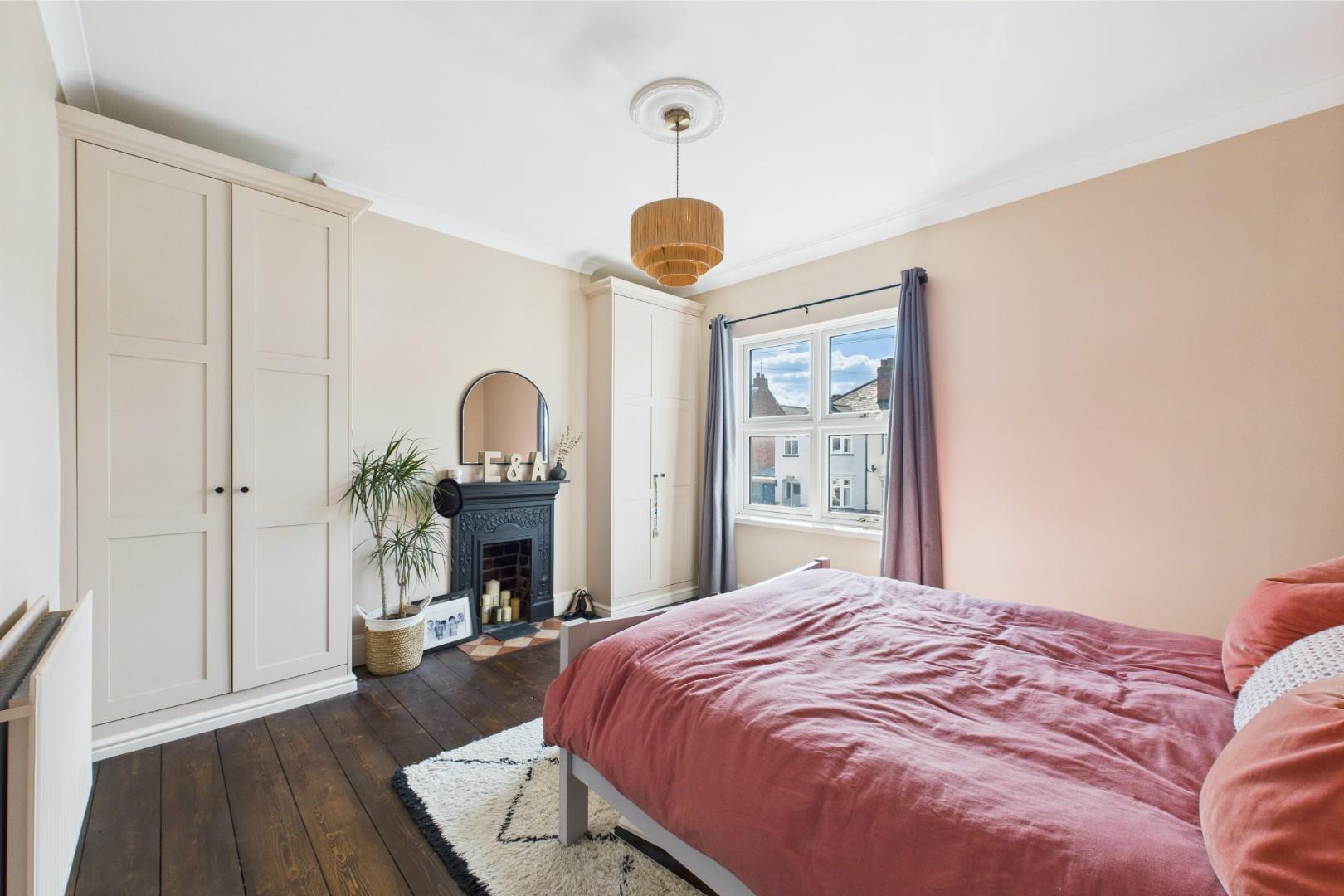 With a door leading from the landing, restored original wood flooring, built in wardrobe storage, traditional fireplace, a double glazed window to the front and a central heating radiator