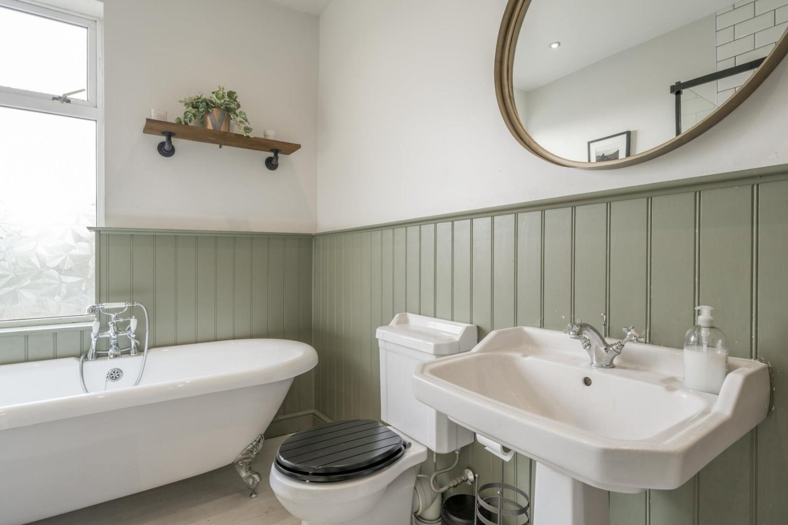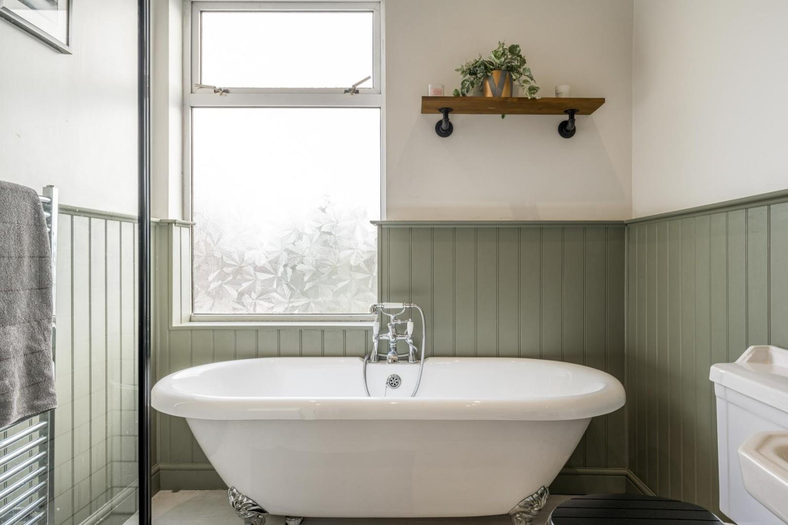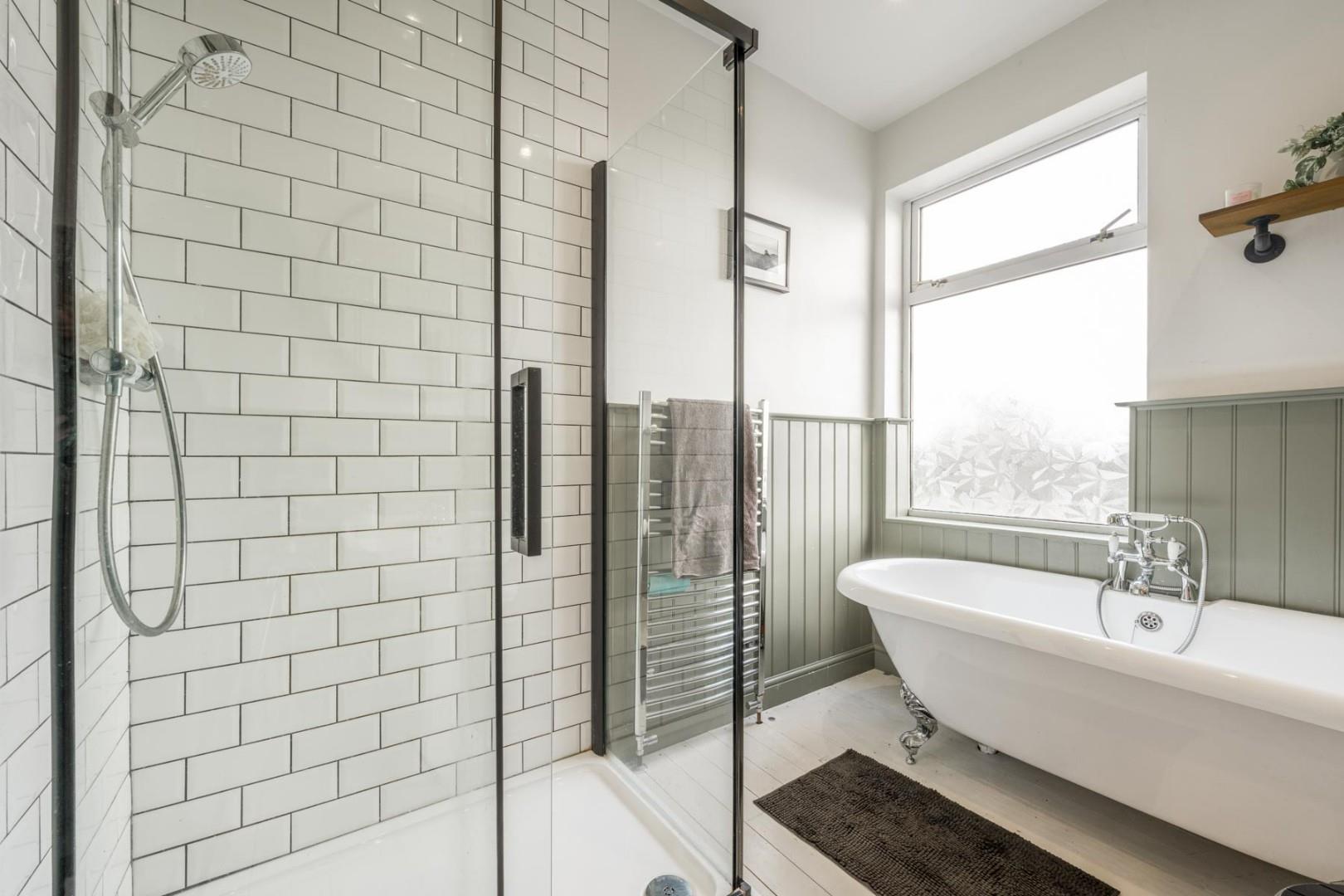 With a door leading from the landing, WC, hand wash basin, walk-in shower cubicle with glass screen, free-standing roll top bath with mixer tap, built in store cupboard, a double glazed window to the rear and a central heating radiator