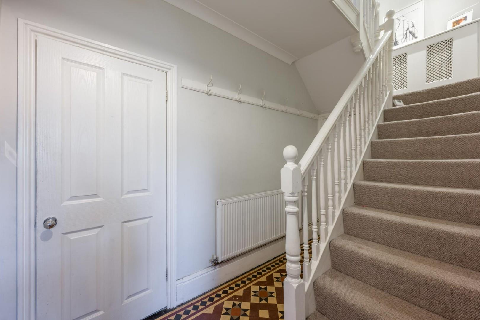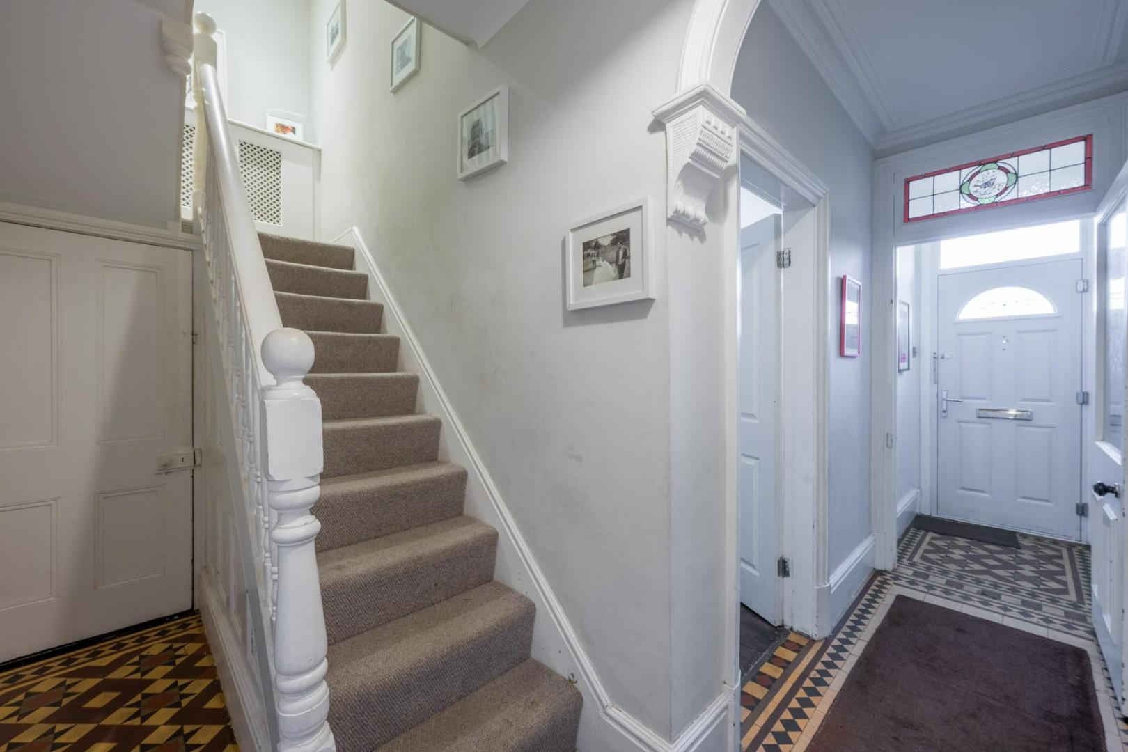 With a door leading from the entrance porch, 'Minton' style tiled flooring, doors to various rooms, a door offering access to the cellar, stairs ascending to the first floor and a central heating radiator