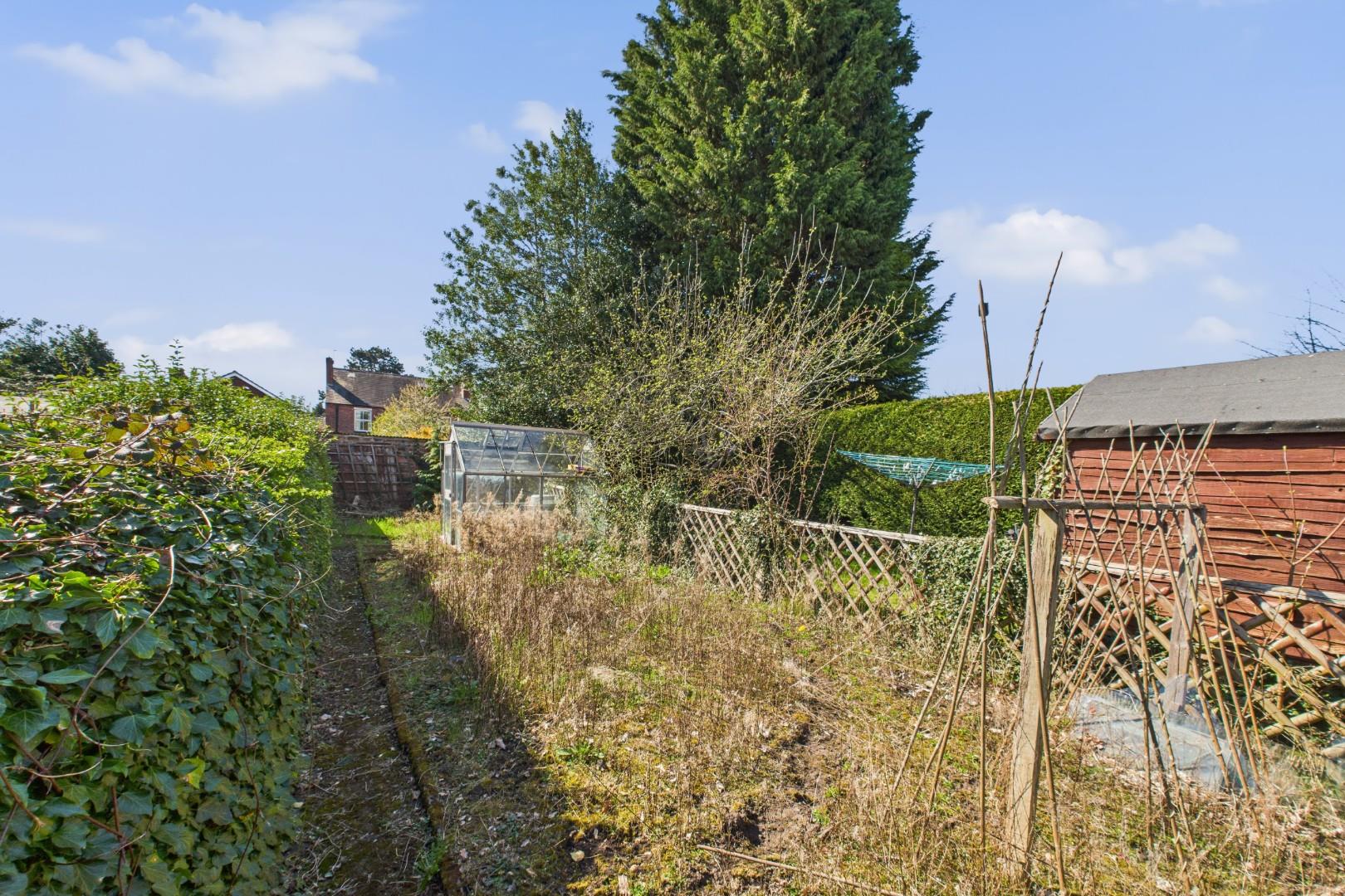 With a door leading from the kitchen, south facing garden with patio area to the front, lawn beyond with vegetable patch and greenhouse to the rear