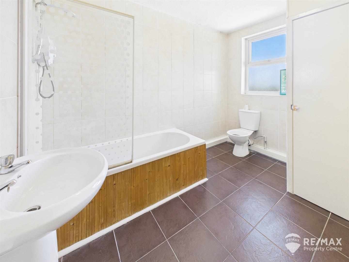 Spacious bathroom with suite comprising panelled bath with wall mounted shower & screen, pedestal wash hand basin, low level WC, airing cupboard and opaque window to rear aspect