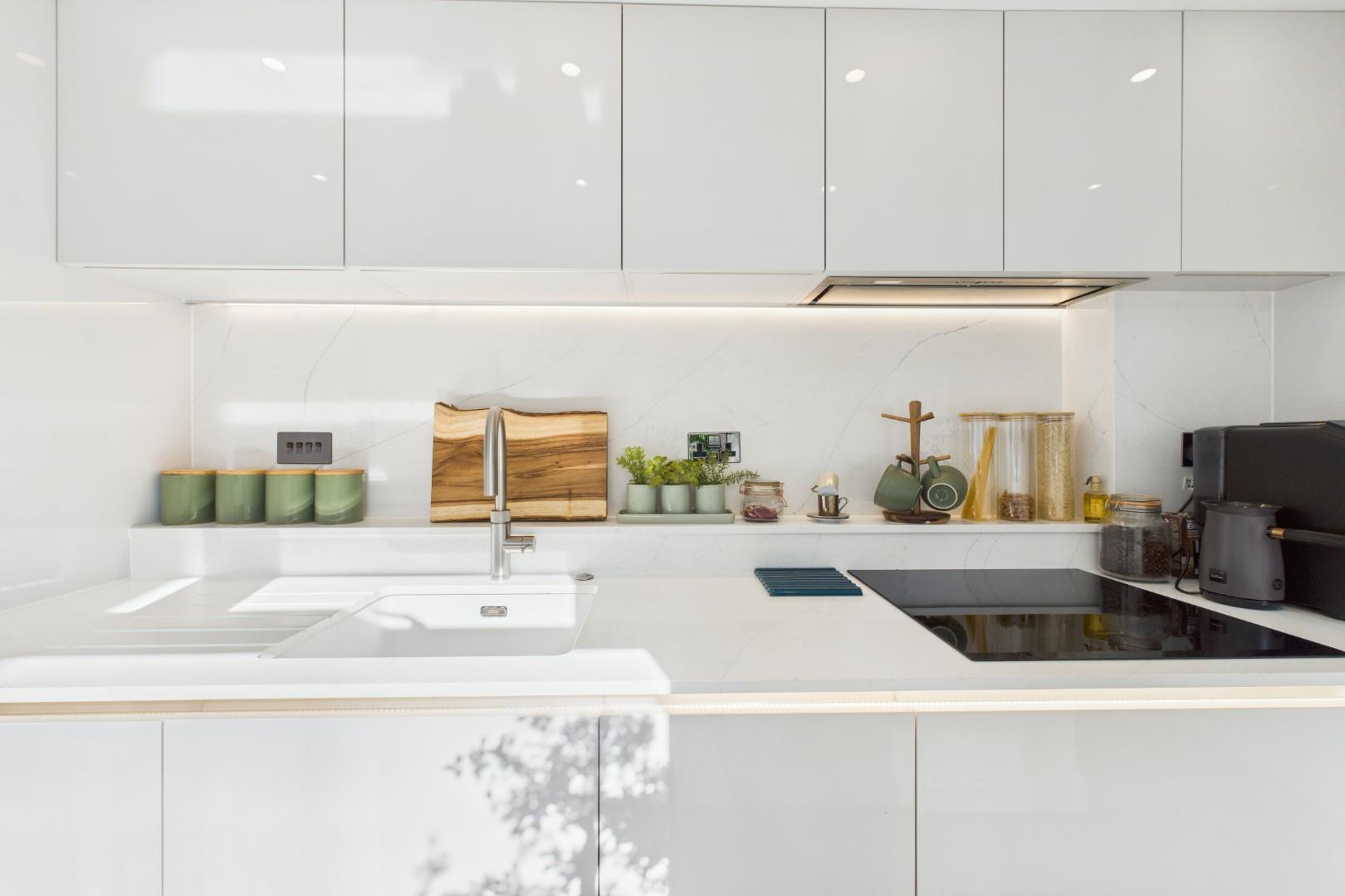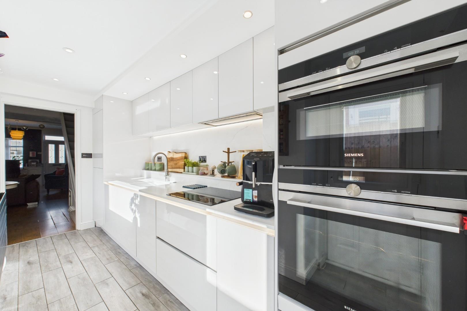 With an opening from the lounge / diner, fitted with a range of wall and base units with Quartz worktops and splashbacks above, integrated LED accent lighting strips, undermounted Franke sink with Quooker boiling water mixer tap and waste disposal unit, drainer grooves, integrated Siemens appliances, hob with extractor hood, a door to the bathroom, a door to the garden, a double glazed window to the side and a central heating radiator